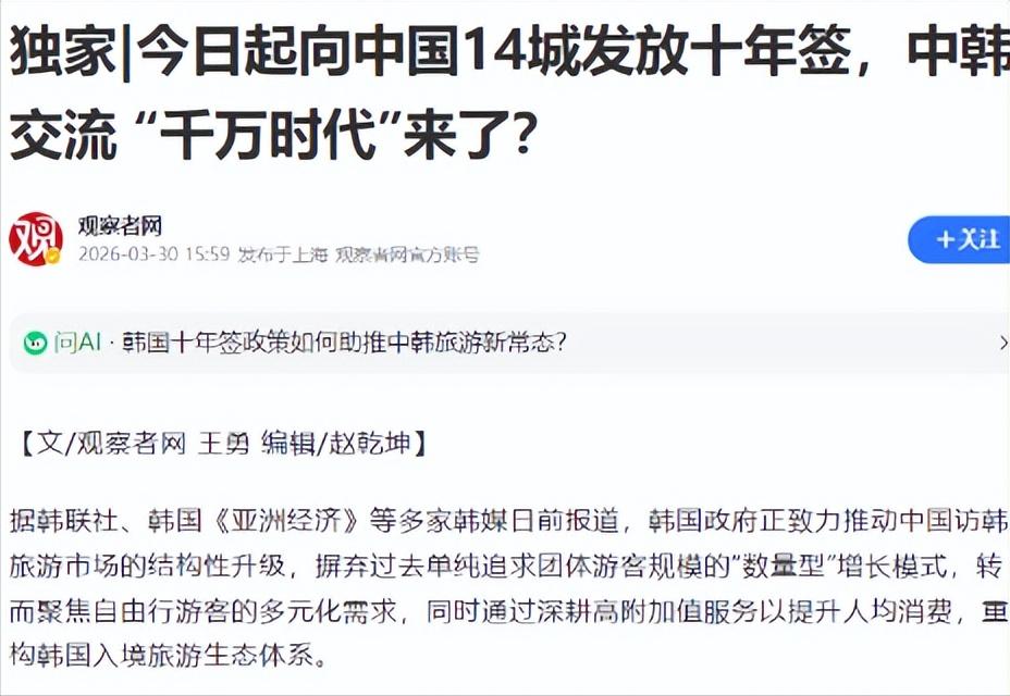 韩国宣布,从3月30日起,对北京、上海、广州、深圳、苏州、厦门、天津、南京、杭州、宁波、武汉、长沙、青岛、重庆等14个城市的中国居民签发十年多次往返签证。 韩国这次开放的十年签,不只是简单延长了有效期,办理起来也格外简便,不用提供资产证明和工作证明,只要有护照、身份证等基础材料就能申请,单次最长能停留90天,旅游、探亲、商务都能用。 而且除了这14个城市的居民,有OECD国家入境记录、高学历或专业人士等群体,也能申请十年签,看得出来,韩国这次是下了血本,一心想吸引中国游客和相关人士频繁往来。 但韩国突然这么大方,可不是单纯的友好示好,背后全是经济的压力。 这些年韩国的经济日子并不好过,尤其是被视为“金字招牌”的免税业,销售额几乎腰斩,2025年的销售额比2019年的峰值下降了近一半,即便访韩游客数量在恢复,免税店的收入也一直上不去。 更让人揪心的是,韩国的旅游收支还出现了巨额逆差,外国游客来韩消费没增长,韩国人出境消费却居高不下,这让本就疲软的经济雪上加霜。 而旅游业,一直是韩国经济的重要支柱,中国游客更是韩国最大的客源地,近十年来,除了疫情期间,中国游客占韩国入境游客的比例长期维持在30%左右,2025年访韩中国游客就有548万人次,占比接近三成。 更关键的是,现在韩国的竞争对手日本,和中国的关系急转直下,自去年日本首相发表涉台错误言论后,中国游客赴日数量大幅下降,去年12月同比降幅甚至达到45.3%,不少原本计划去日本的游客,开始转向韩国。 这对韩国来说,无疑是天赐良机,所以才急急忙忙推出十年签政策,就是想趁机抢占中国游客市场,靠旅游业拉动消费、提振经济,韩国央行也测算过,相关政策预计能吸引100万人次增量游客,带动GDP提升0.08个百分点。 但最关键的问题是,韩国虽然抛出了橄榄枝,却未必做好了接住中国游客的准备。嘴上说着要热烈迎接中国游客,要培养更多中文导游、在机场举办欢迎活动,但实际情况却不尽如人意。 目前韩国的中文导游数量依然不足,很多热门景点的服务人员还是不会说中文,给中国游客的出行带来不少麻烦。更矛盾的是,韩国的免税业还没适应中国游客的消费变化。 以前中国游客多靠代购扫货,现在更多人是自由行,喜欢精准购物,可韩国免税店还是老一套,不仅价格优势不再,服务也没跟上,就连新罗、新世界这样的大型免税店,都退出了仁川机场的免税店竞标。 除此之外,韩国的交通、住宿配套也有短板,虽然计划加密邮轮航次、增加航线,但短期内很难满足可能激增的中国游客需求。 说到底,韩国这次开放十年签,本质上就是一场“救急”,想借着日本的劣势,靠中国游客盘活自身的旅游经济,缓解经济压力。 这份心思无可厚非,但韩国如果只想着“抢客”,却不做好配套准备,不解决中文服务、消费体验等实际问题,即便有十年签的吸引力,也很难留住中国游客。 毕竟游客出门旅游,图的是方便和舒心,要是各种不便,就算签证再便利,也没人愿意反复前往。韩国能不能抓住这次机会,关键不在于签证政策多诱人,而在于能不能真正做好准备,兑现“热烈迎接”的承诺,这才是韩国当下最该解决的难题。