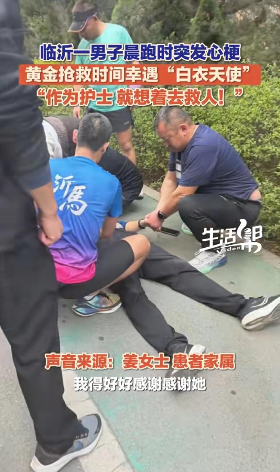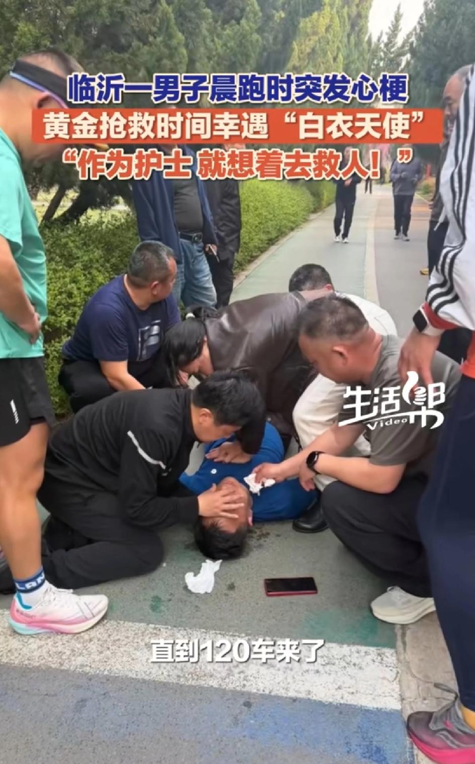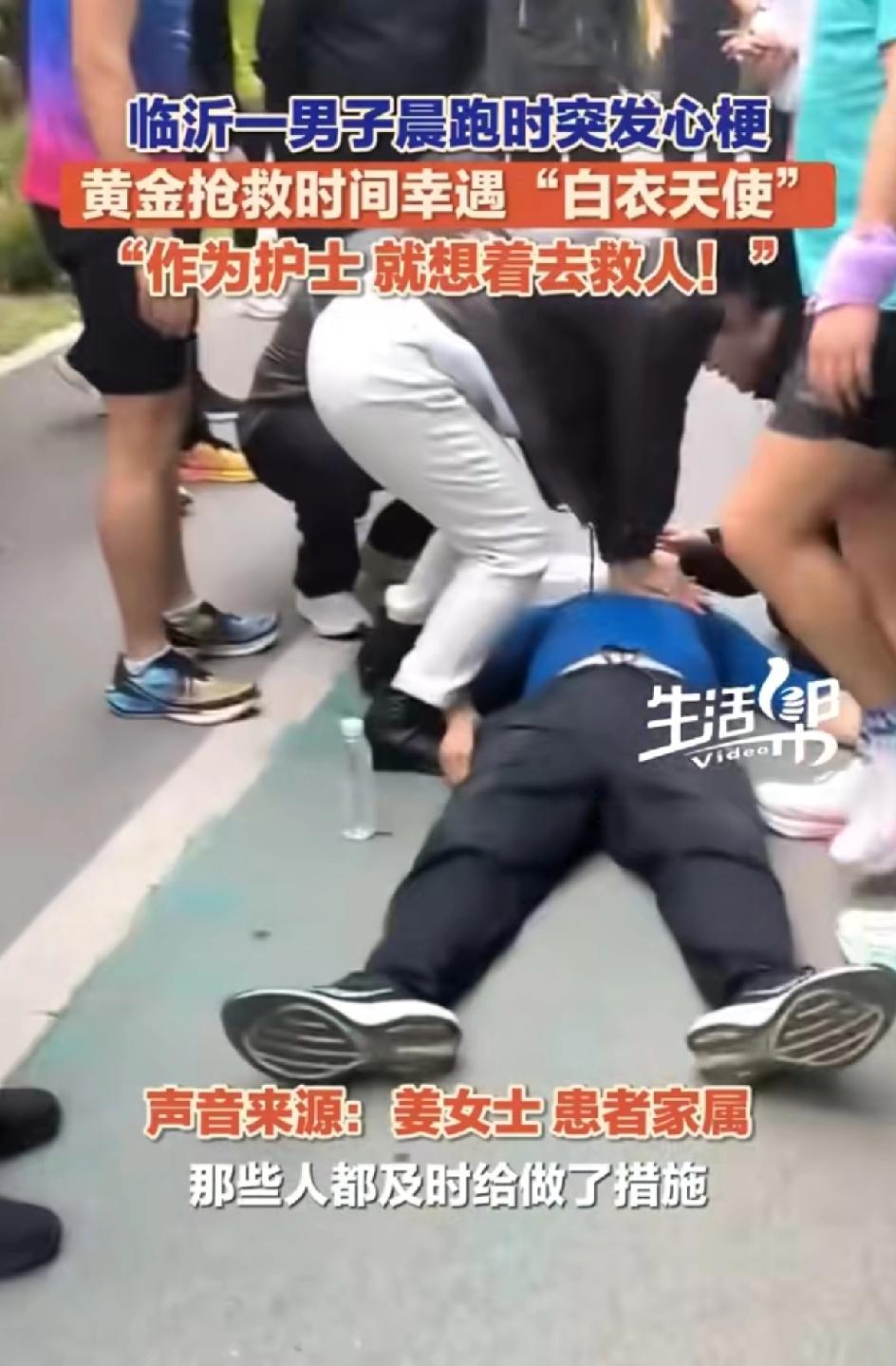 4月1日,山东临沂罗庄,男子晨跑时突发心梗倒地,旁边人手忙脚乱。正好一护士路过,