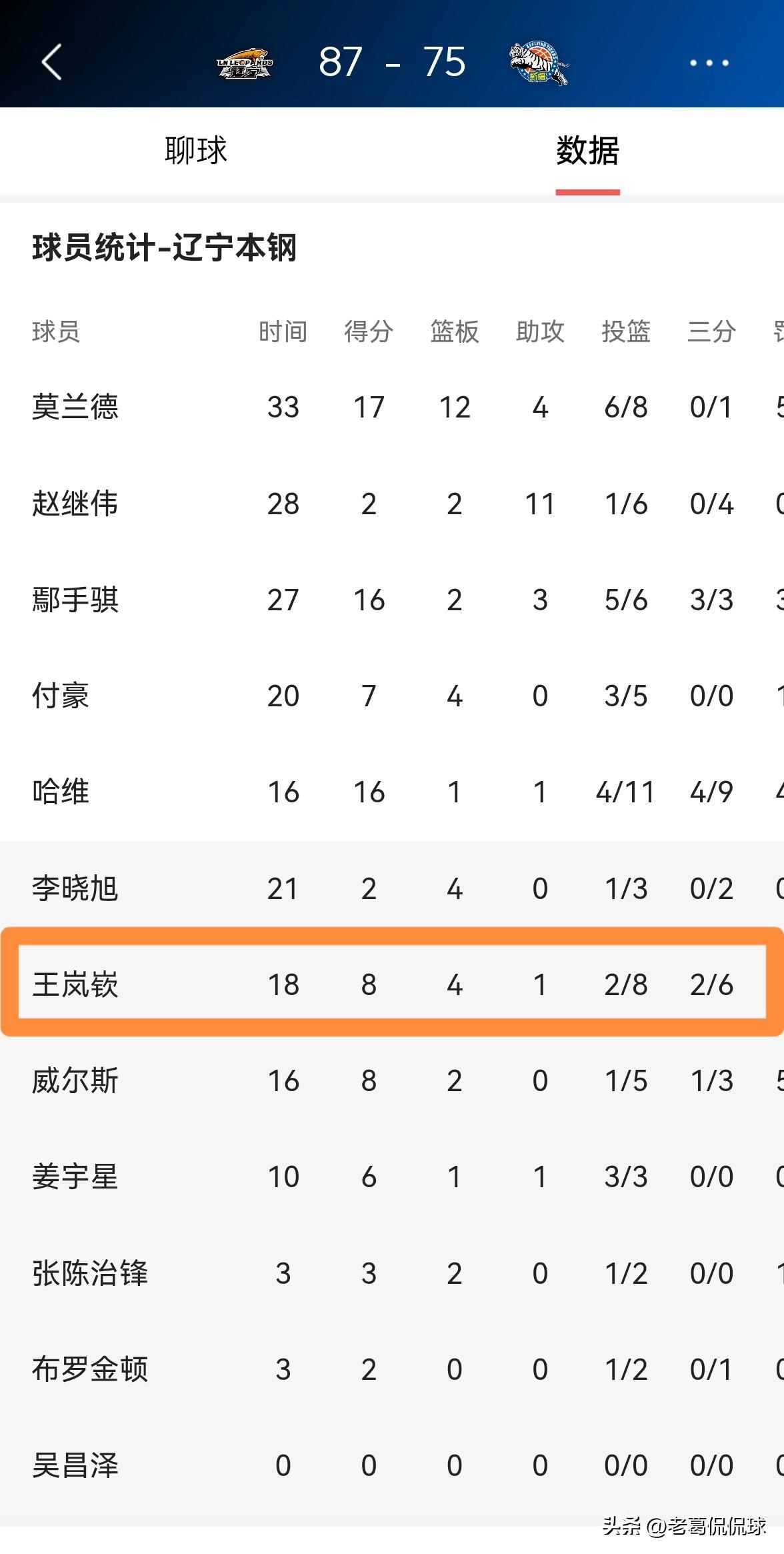 辽宁本钢大将王岚嵚真是一如既往的低迷!虽然今天辽宁本钢在主场以87:75战胜新疆伊犁特,但是王岚嵚延续了最近一段时期的低迷状态,他在进攻端始终找不到投篮手感。 全场比赛下来,王岚嵚替补出战18分钟,投篮8中2,其中三分球6中2、罚球2中2非常低效的得到8分。 说实话,王岚嵚和赵继伟真是一对好兄弟,当赵继伟手感冰凉的时候,王岚嵚也会陪着手感冰凉,本场比赛赵继伟的投篮手感比王岚嵚还要冰凉。