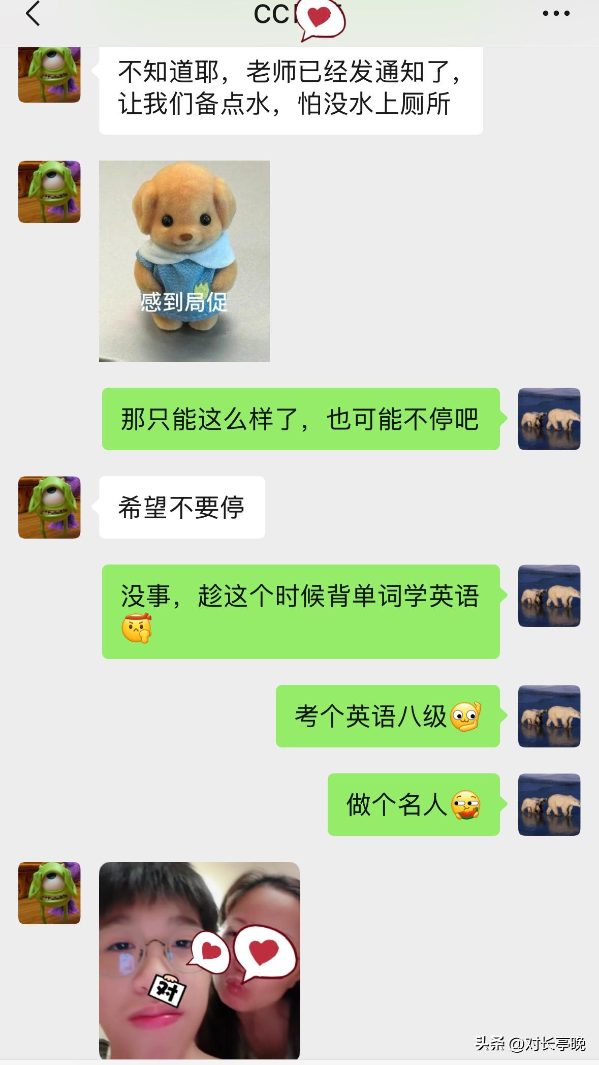 安全起见,我让她不要瞎跑,就呆在宿舍里学习,并鼓励她考取英语八级。其实我也不知非英专业能否考英语八级,只是我觉得她学习潜力很大,完全可以再上一个台阶。她同意不回了,还发来一个我们之前视频的表情包。