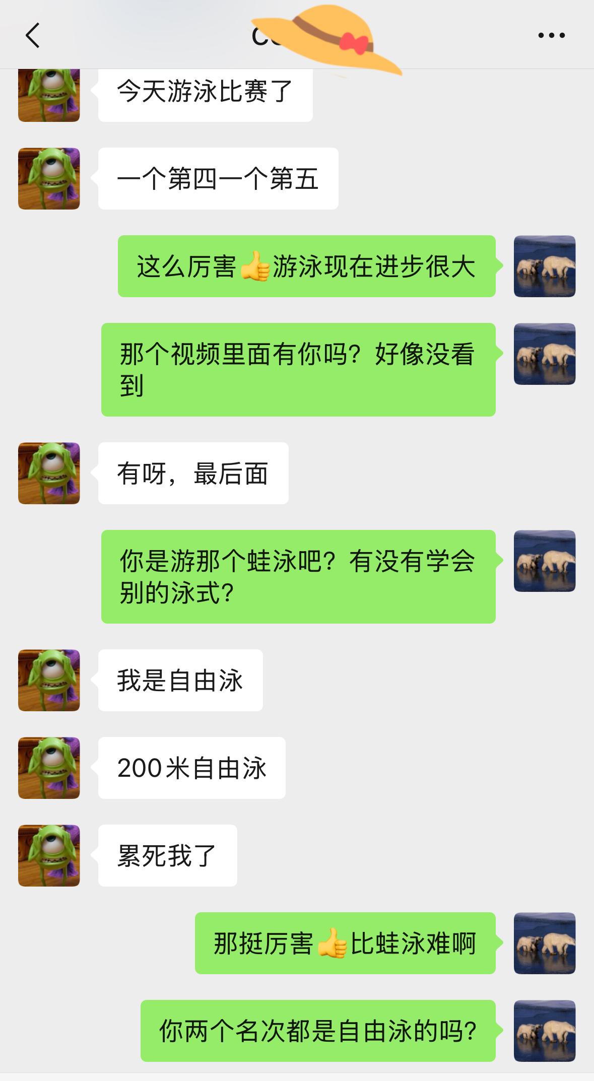 临睡前,表侄女发信息告诉我,今年大学运动会中两项游泳比赛她都取得了名次(第四和第五),还发来比赛视频,非常了得!游泳是她小时候暑假时,我和LG在小区泳池教会她的,从没进过任何培训班,纯属自学成才。