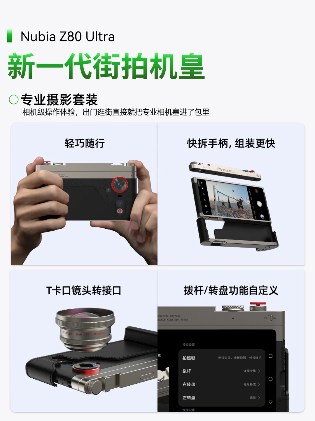 再加上努比亚量身推出的Z80Ultra专业摄影套装,经典复古外观+机械操作设计,能像操作专业相机一样进行盲操,拍照超有仪式感!简直就是最有机械操作仪式感的摄影套装