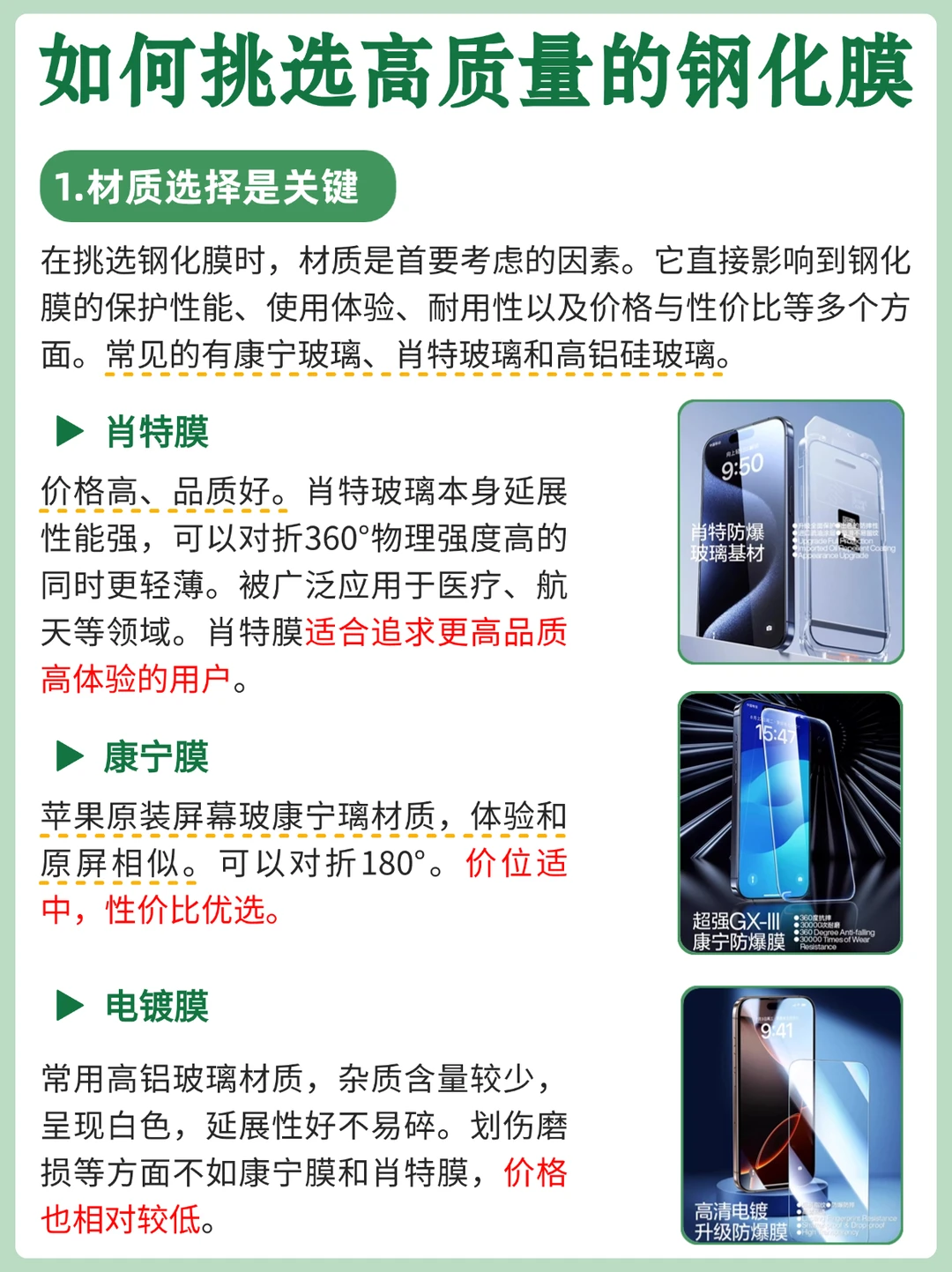 常用高铝玻璃材质,杂质含量较少,呈现白色,延展性好不易碎。划伤磨损等方面不如康宁膜和肖特膜,价格低廉,日常使用也足够。