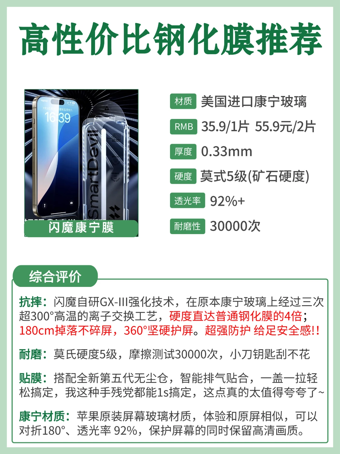 总体比较,更推荐康宁玻璃材质的钢化膜,不仅是苹果原装屏幕玻璃材质,体验和原屏相似。透光率,韧性,硬度,耐磨度,防指纹方面都表现的非常好。而且价位适中,性价比超高!