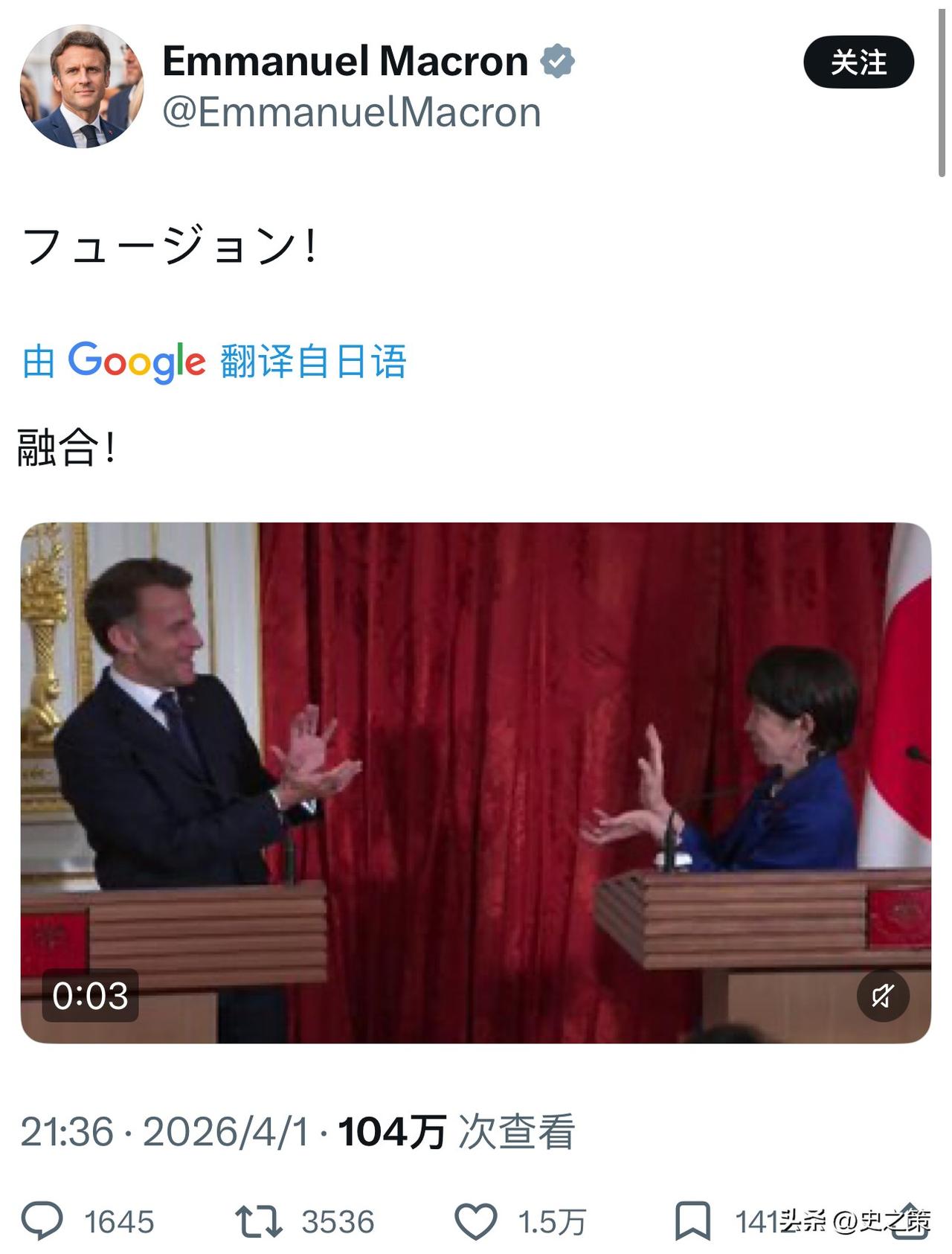 2天下来,马克龙表现的很高兴,多次用日语发文介绍这次的行程。而4月1号晚上,马克龙还和高市早苗召开了联合记者会。结束的时候,谁都没想到:高市早苗突然对着马克龙摆出了“龟派气功”的动作。