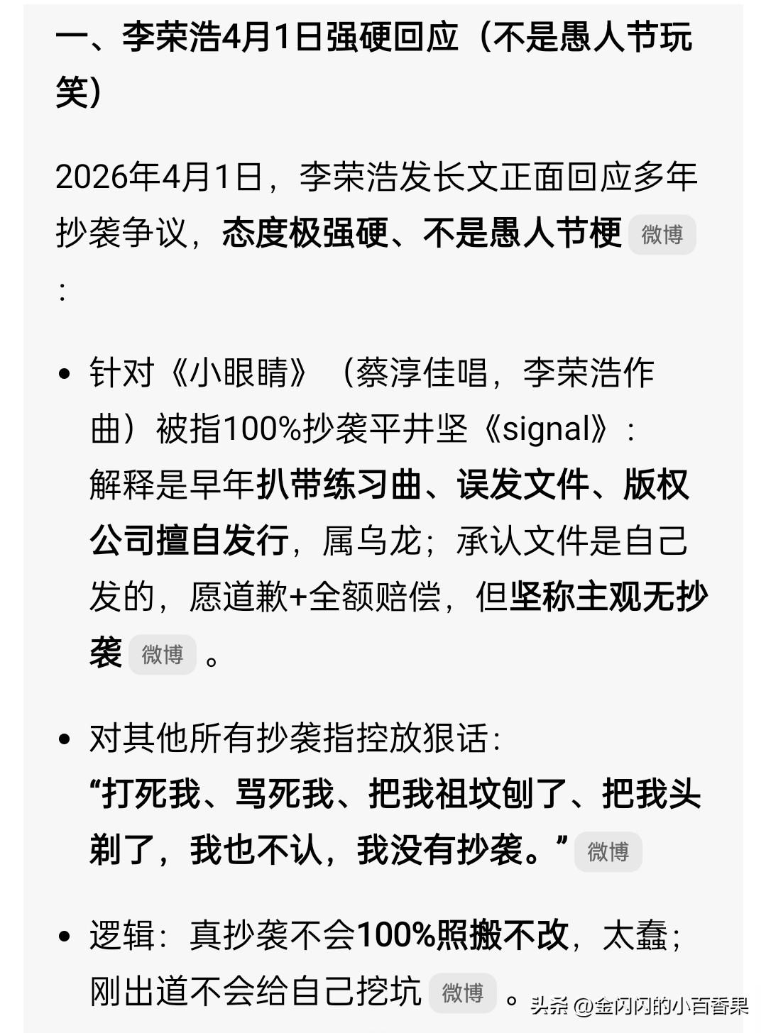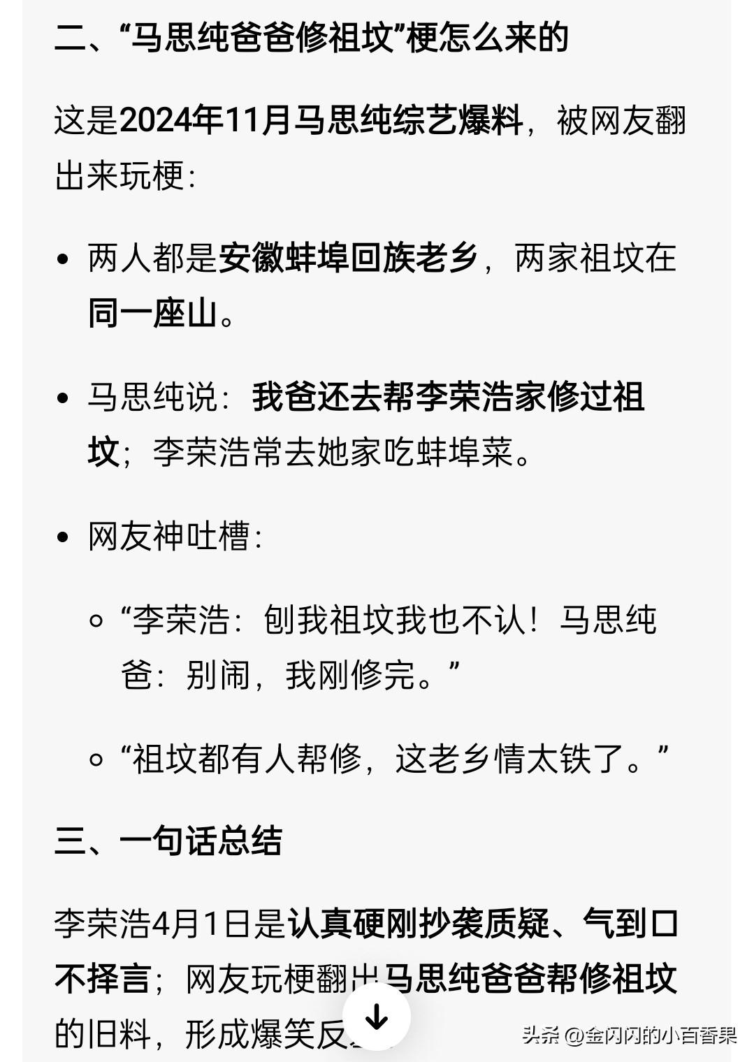 李荣浩这哪是过愚人节,分明是气急了直接叫嚣!放狠话就算打死我、骂死我、把我祖坟刨了、把头剃了,也死不认抄袭,气到口不择言,话都说到这份上了。 结果网友脑洞太大,压根不关心抄袭那点事,八怪着八怪着,直接炸出个惊天大瓜——李荣浩家祖坟居然是马思纯爸爸修的!我的天呐,还能这么玩的吗? 我一搜直接笑疯,网友还玩梗:马思纯老爸在线喊话,别闹,刚修完!哈哈哈怎么聊着聊着,一下就干到祖坟上去了,这剧情比歌还离谱,笑到停不下来。