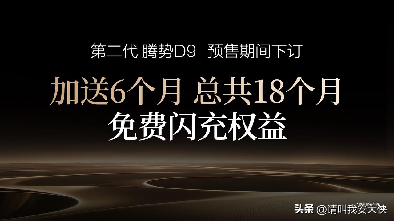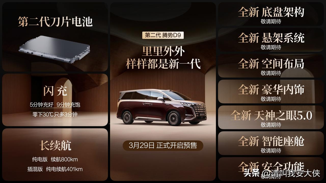 第二代腾势D9终于开启预售了!38.98万元起,这台“科技豪华旗舰MPV”真的把期待值拉满了 一眼心动的是它的全新前脸“展翼腾飞”,矩阵式高亮金属羽翼层层展开,气场直接拉满!内饰更是百万级豪华标准,标配怀挡、NAPPA真皮座椅、零压云绒座椅,中排舒适感堪比头等舱副驾还有开合智能屏,追剧刷视频都超方便~ 最让我惊艳的是它搭载了比亚迪第二代刀片电池!插混版纯电续航401km,纯电版高达800km,关键是“5分钟充好,9分钟充饱”,买杯咖啡的时间就能满电出发,彻底告别里程焦虑 全系标配天神之眼5.0,端到端智能驾驶,比老司机还稳还准,出行更安心 商务接待有排场,家庭出行有温度,远行还无焦虑,真的样样都新、处处都卷 即日起下订还能享受18个月免费闪充权益,抢先一步,坐腾势,定局势!上市发布会还有更多惊喜,一起期待吧 第二代腾势D9 腾势D9 豪华MPV 闪充MPV 科技豪华 比亚迪