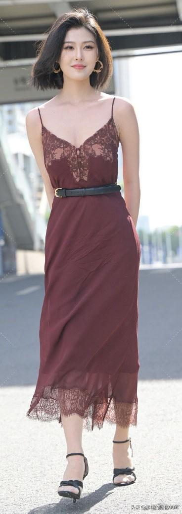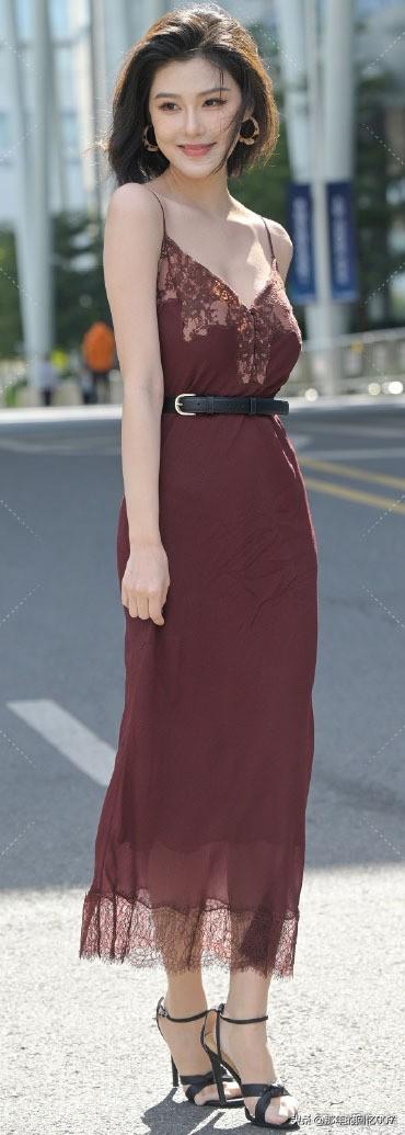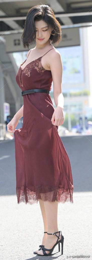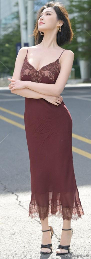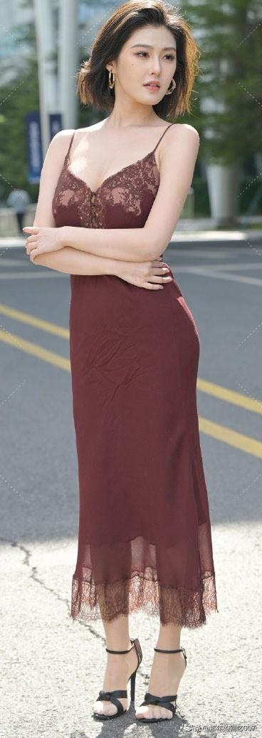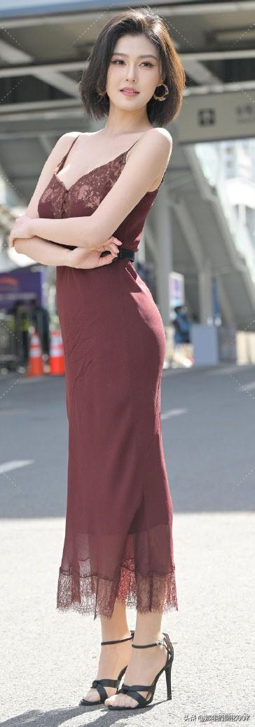 一袭长裙的御姐型美女,那气场简直绝了。就说穿搭,黑色丝绒包臀紧身长裙配黑色缎面吊