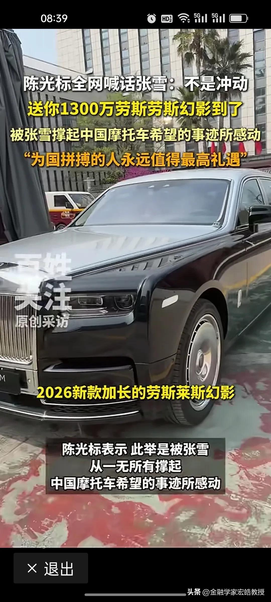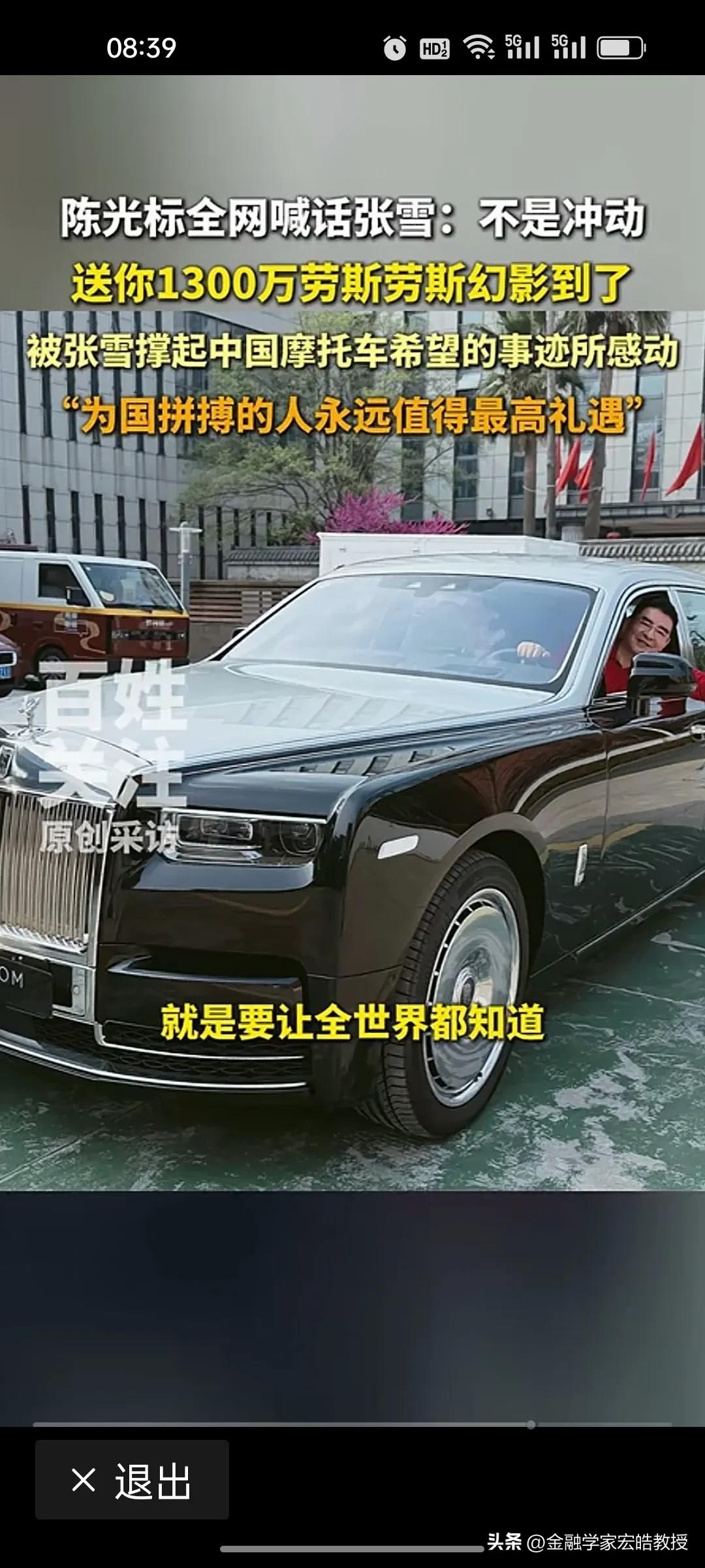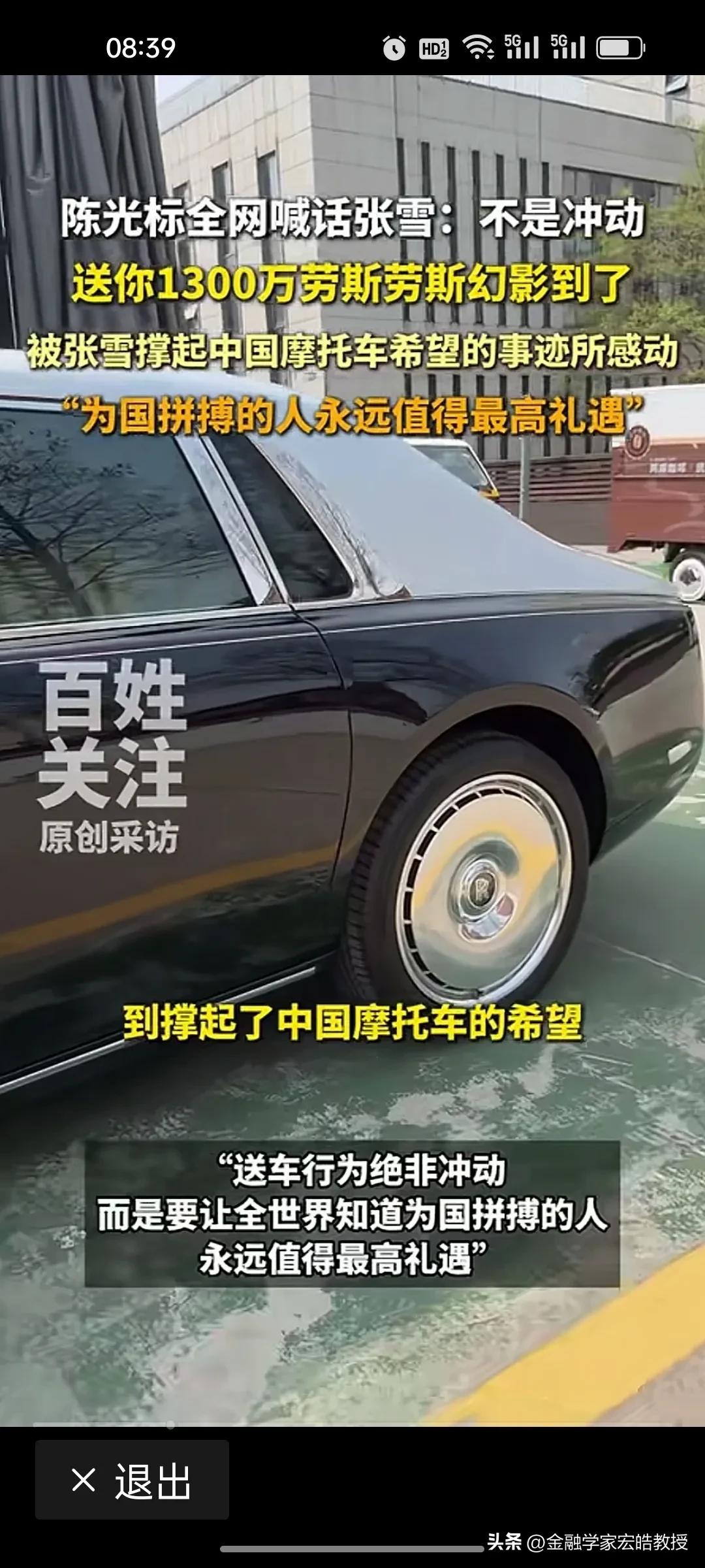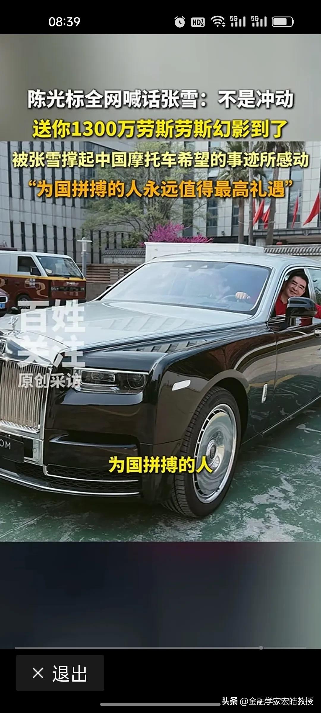 张雪造车,为的是热爱、是理想、是打破国外垄断,从来不是为了名利。劳斯莱斯再贵,也抵不过他心中那台国产赛车的分量。张雪团队目前还没有就陈光标送车一事作出回应。你觉得张雪会收下这份厚礼吗?