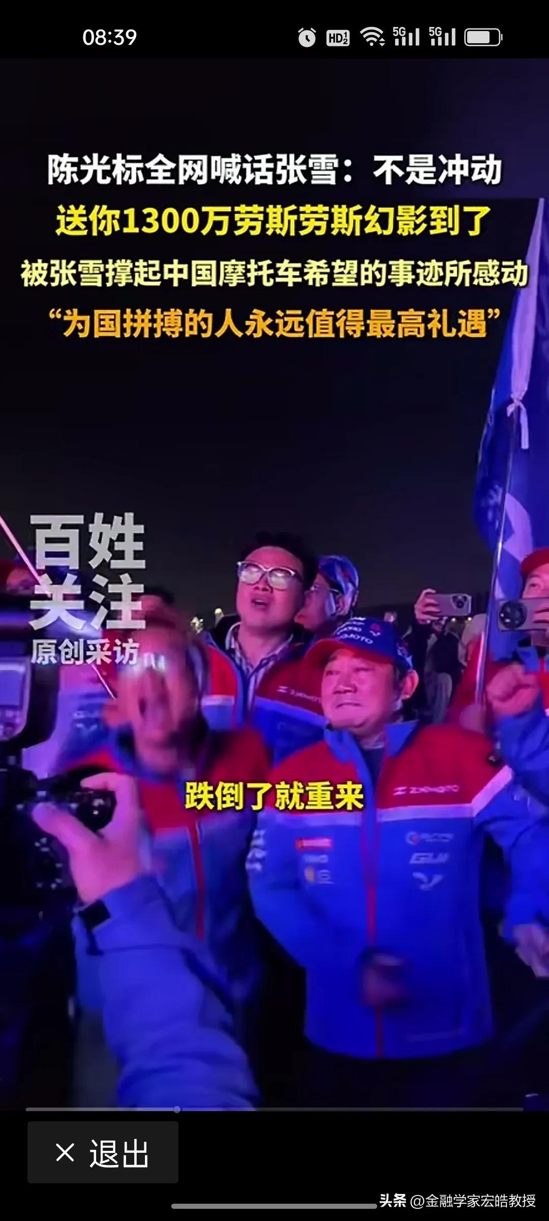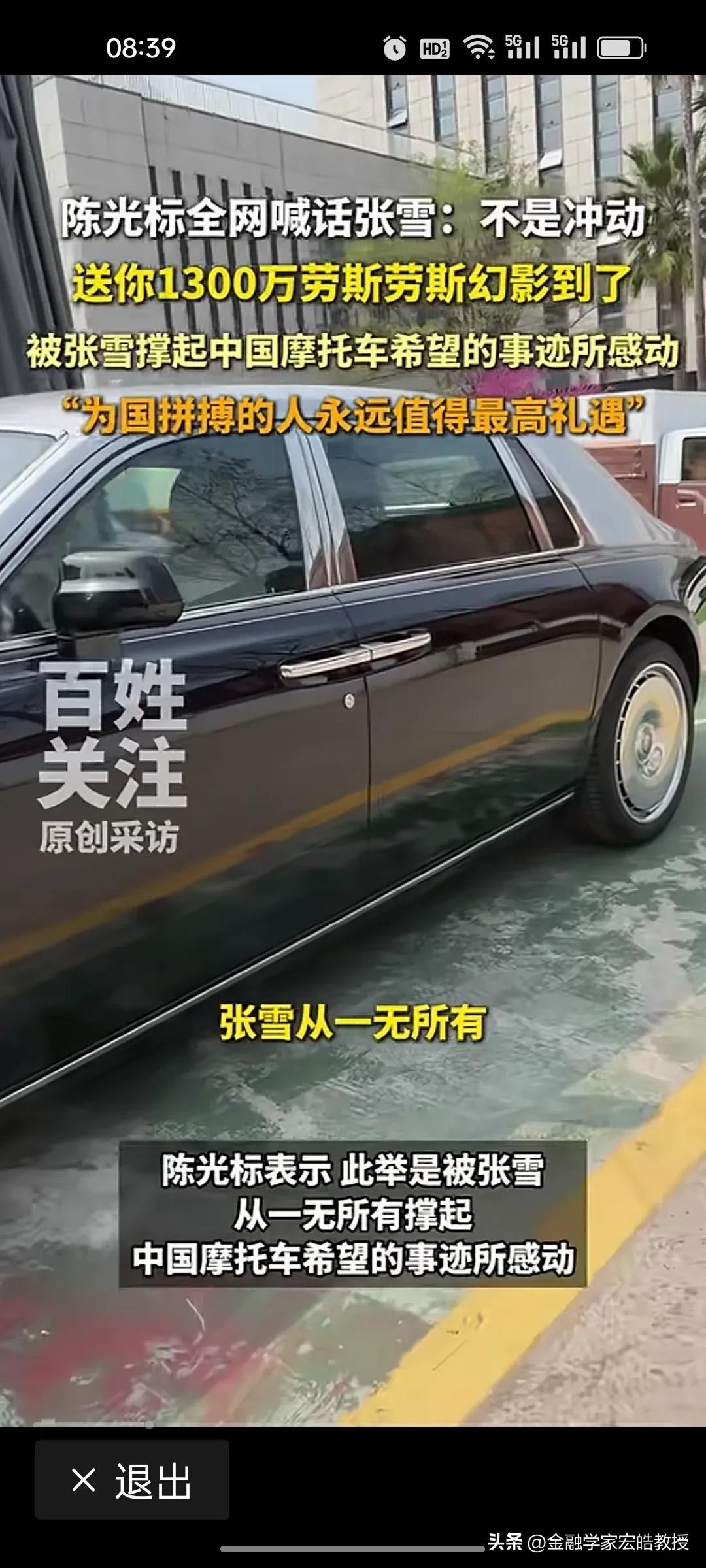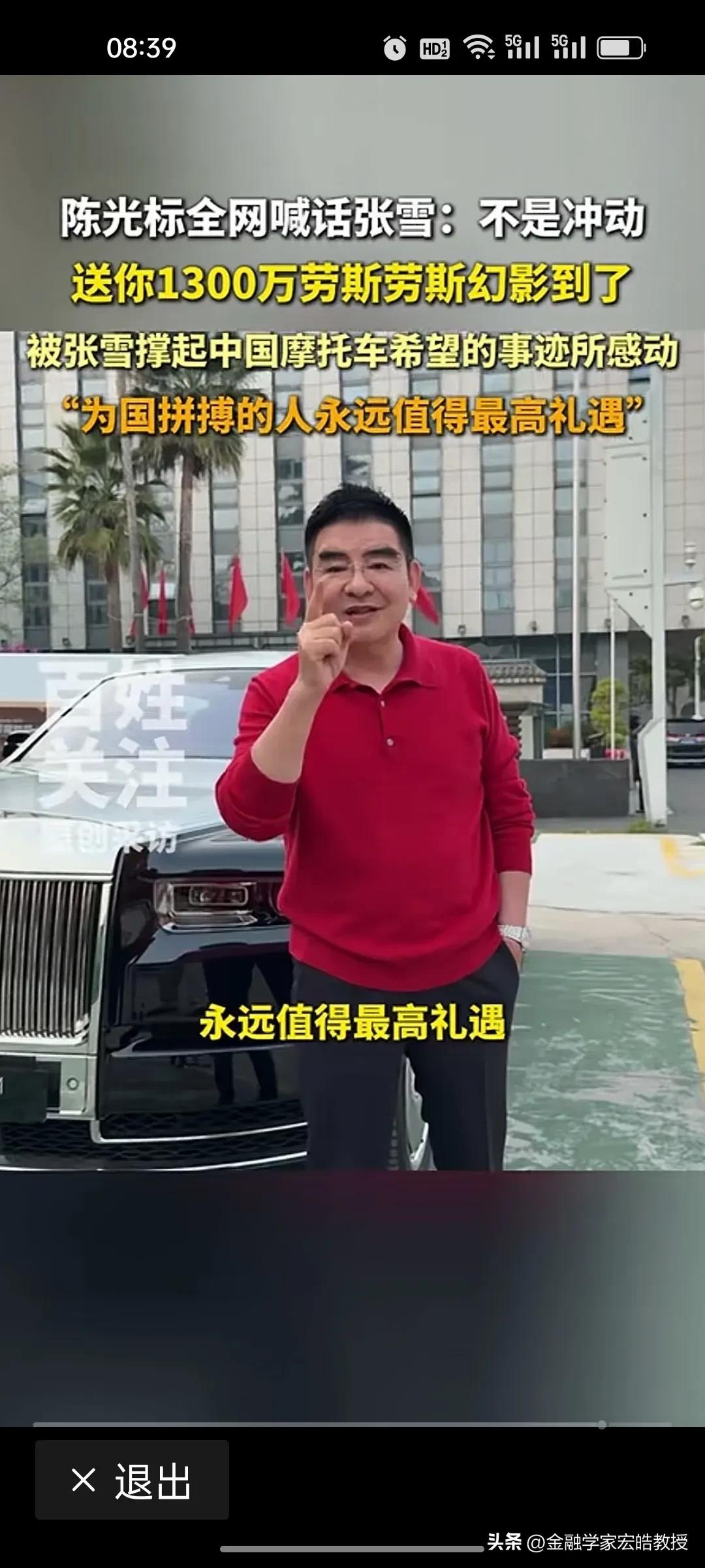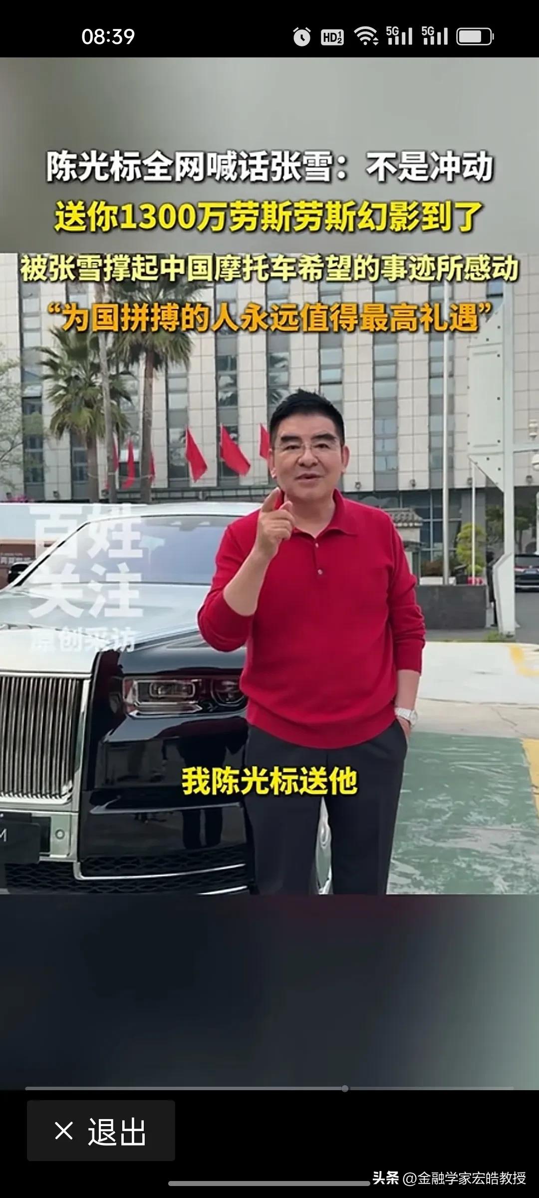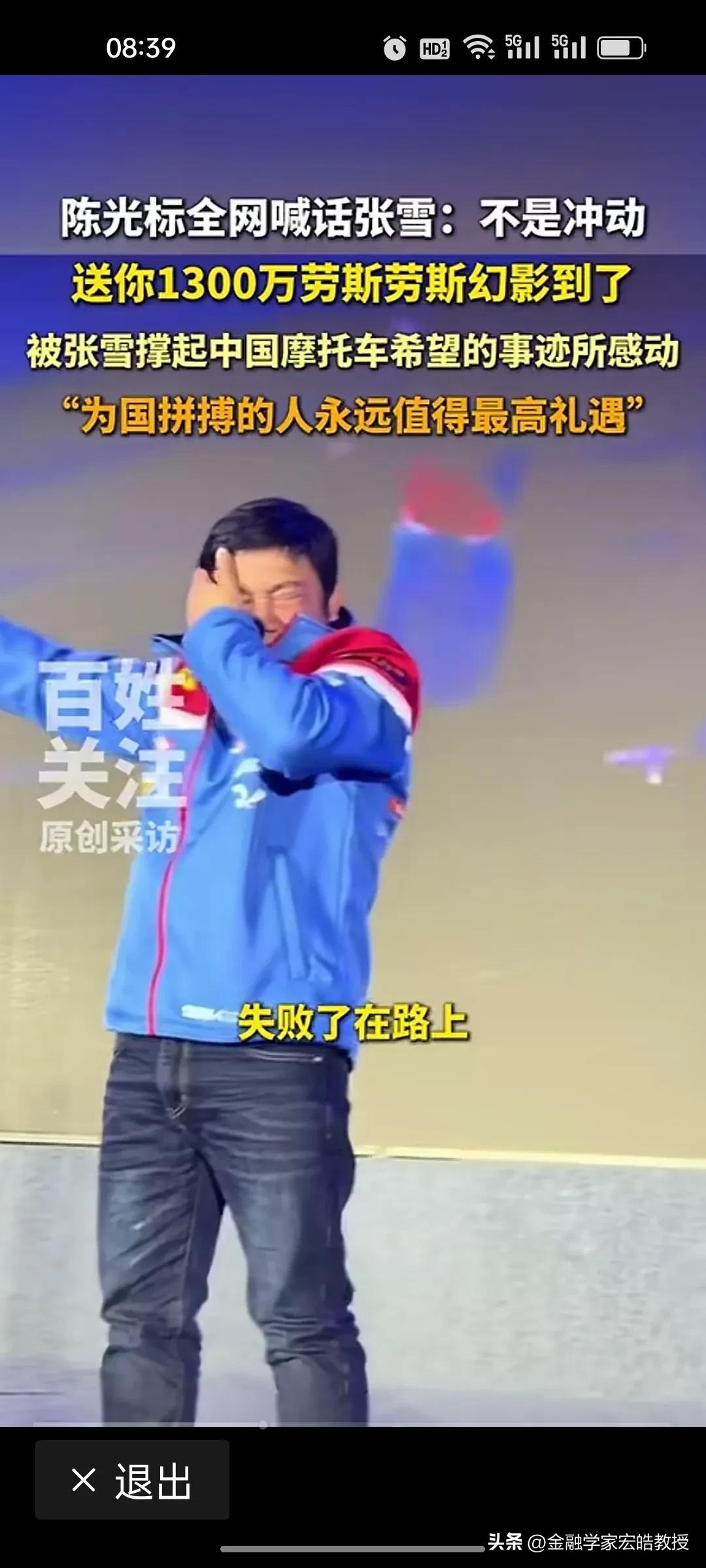 张雪造车,为的是热爱、是理想、是打破国外垄断,从来不是为了名利。劳斯莱斯再贵,也抵不过他心中那台国产赛车的分量。张雪团队目前还没有就陈光标送车一事作出回应。你觉得张雪会收下这份厚礼吗?