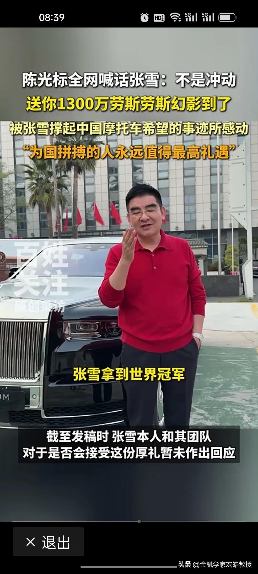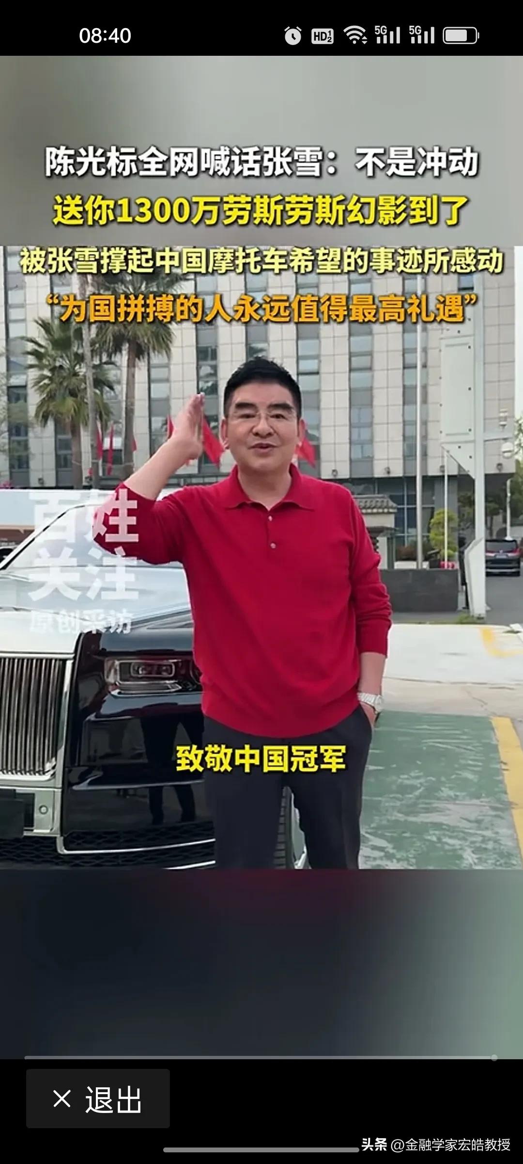 好心人陈光标送1300万劳斯莱斯奖励张雪为国争光,张雪会收吗?我赌他一定不会!