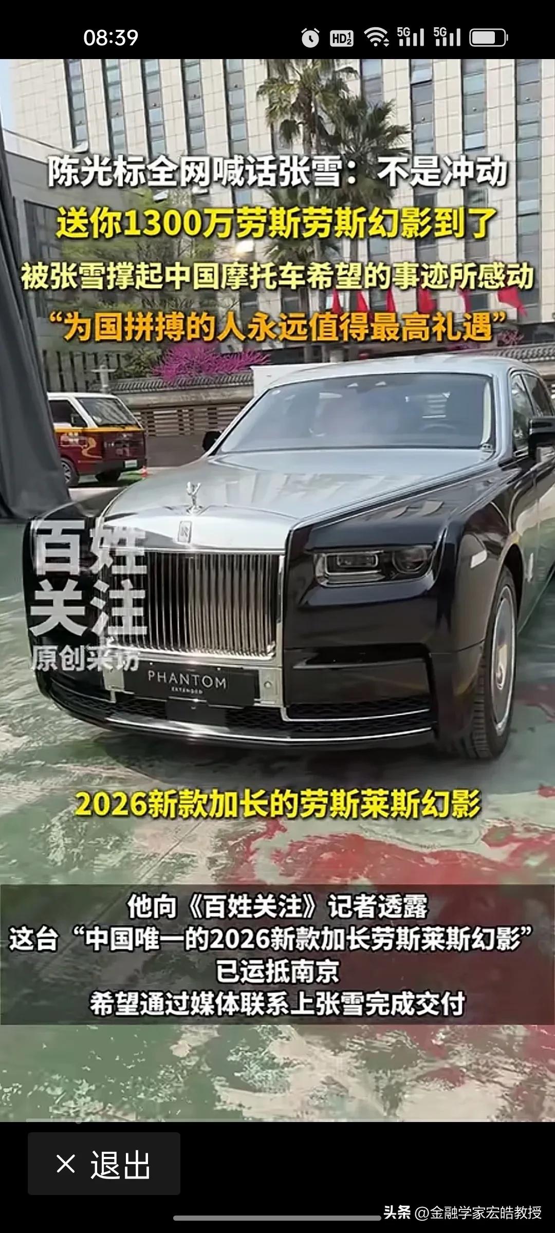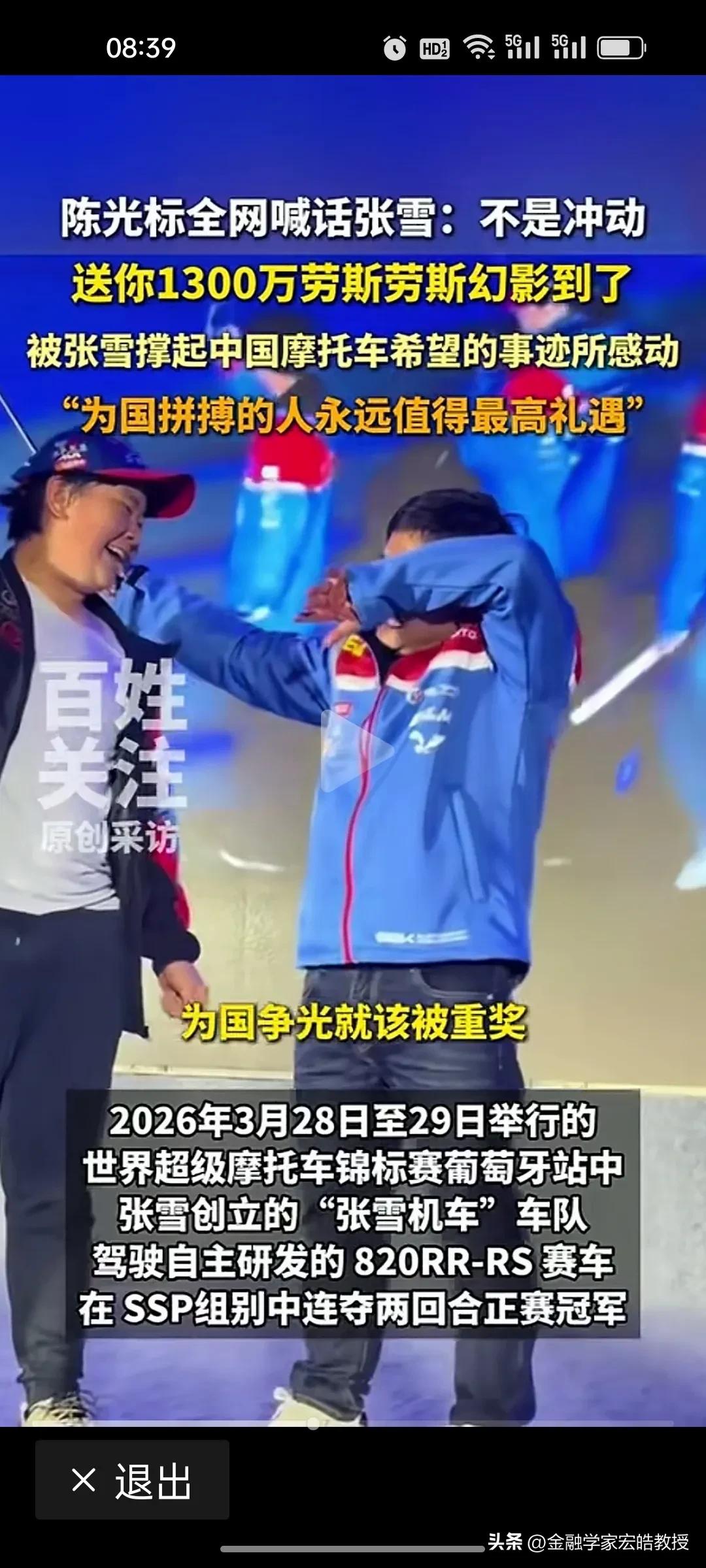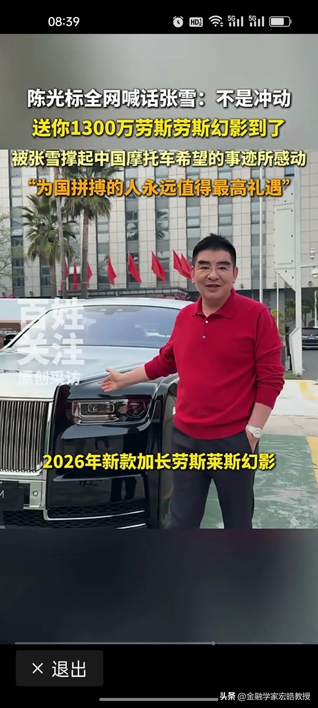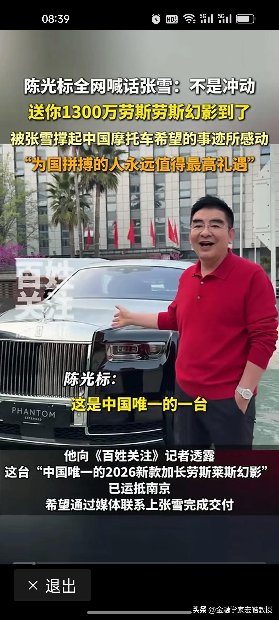 陈光标用中国唯一一台2026款加长幻影,奖励为国争光的张雪机车,这份善意和格局,没人会质疑。但我敢说,张雪团队大概率不会收!