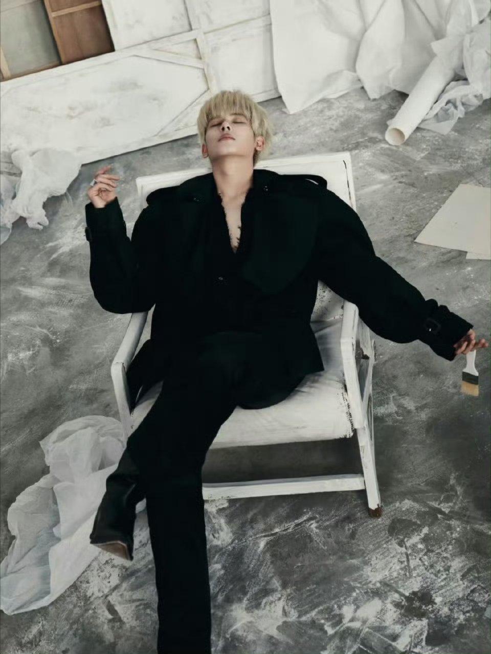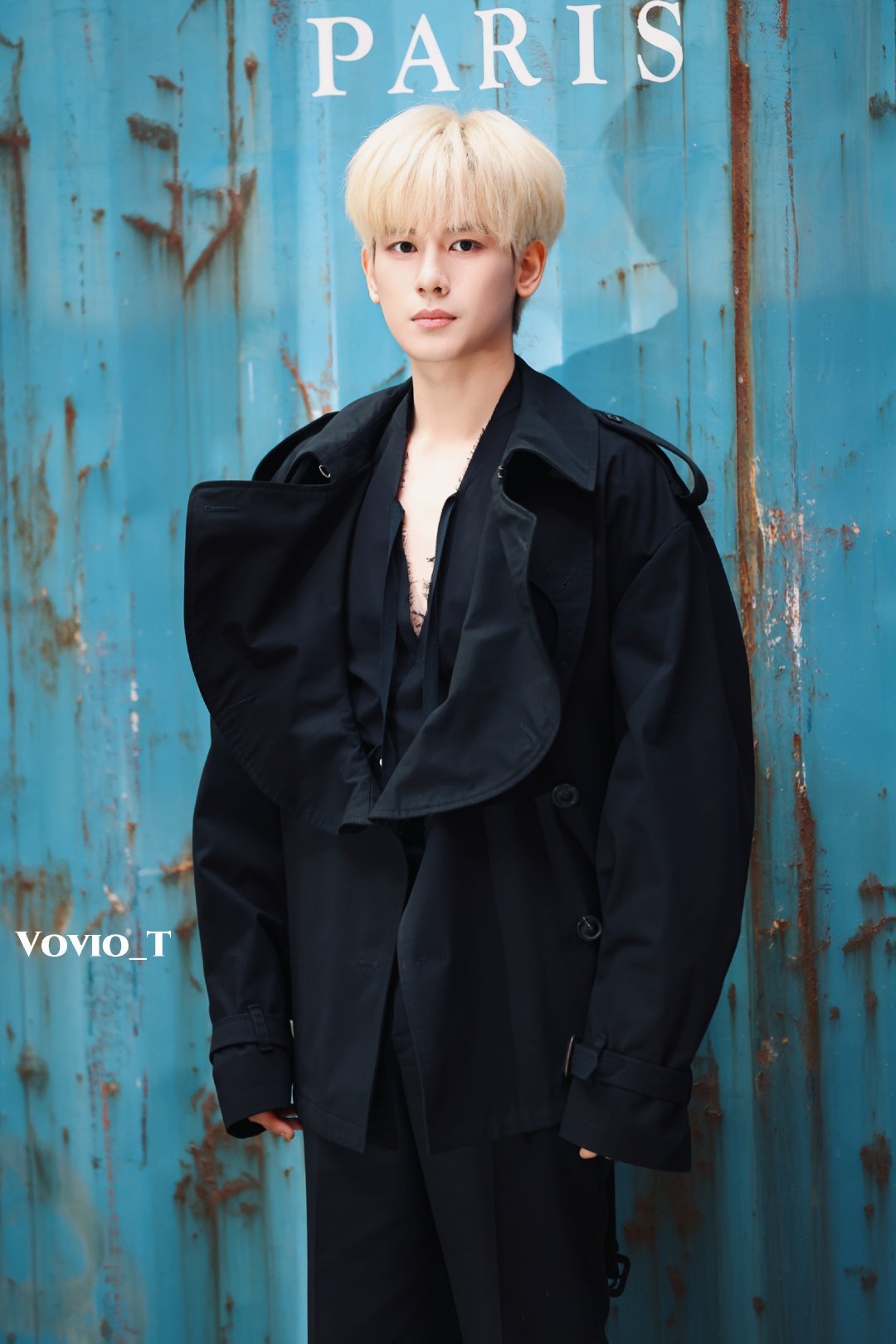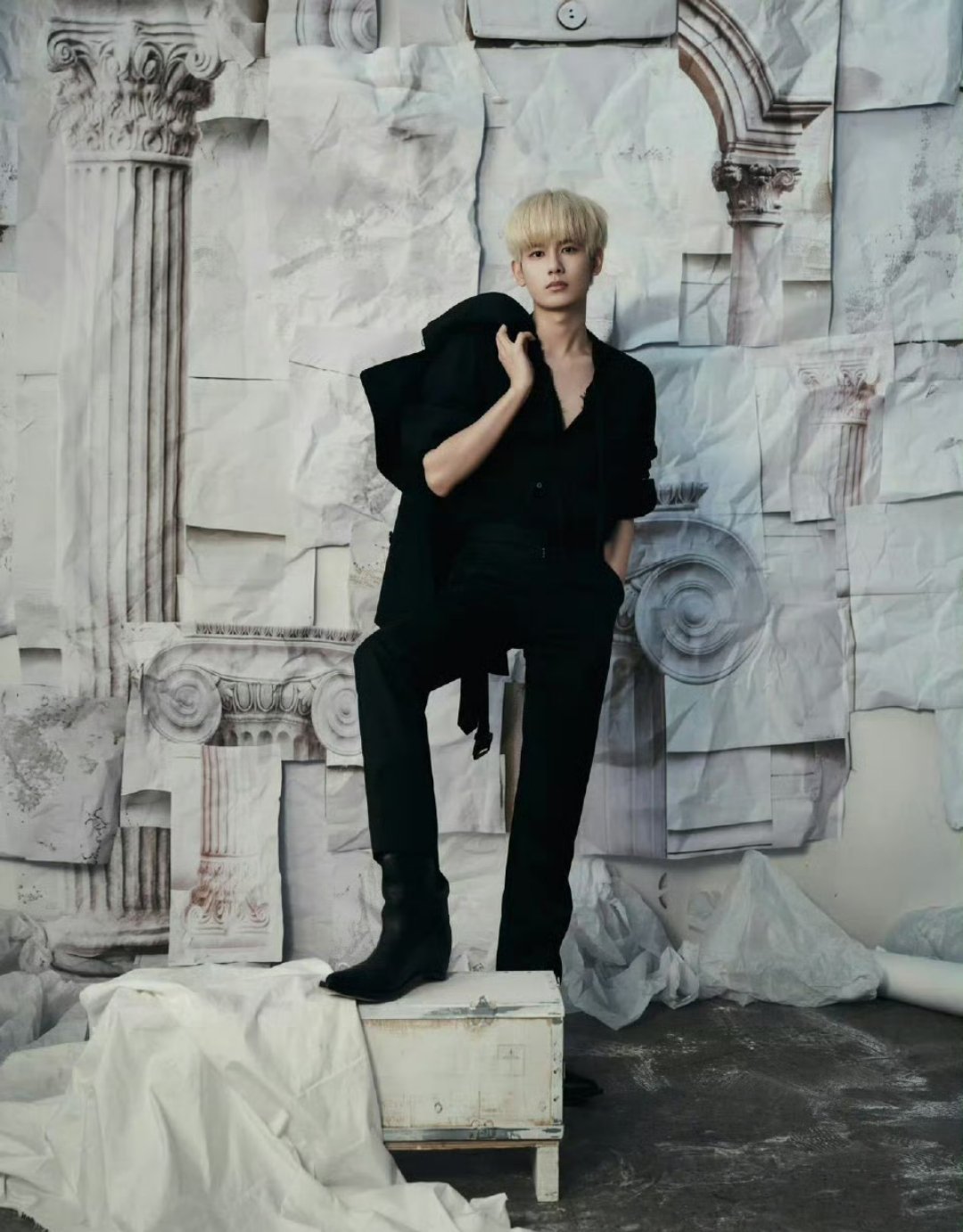 胡先煦金发深V 冷调浅金与冷白肤色形成强烈视觉反差,夸张翻领与利落剪裁强化了先锋