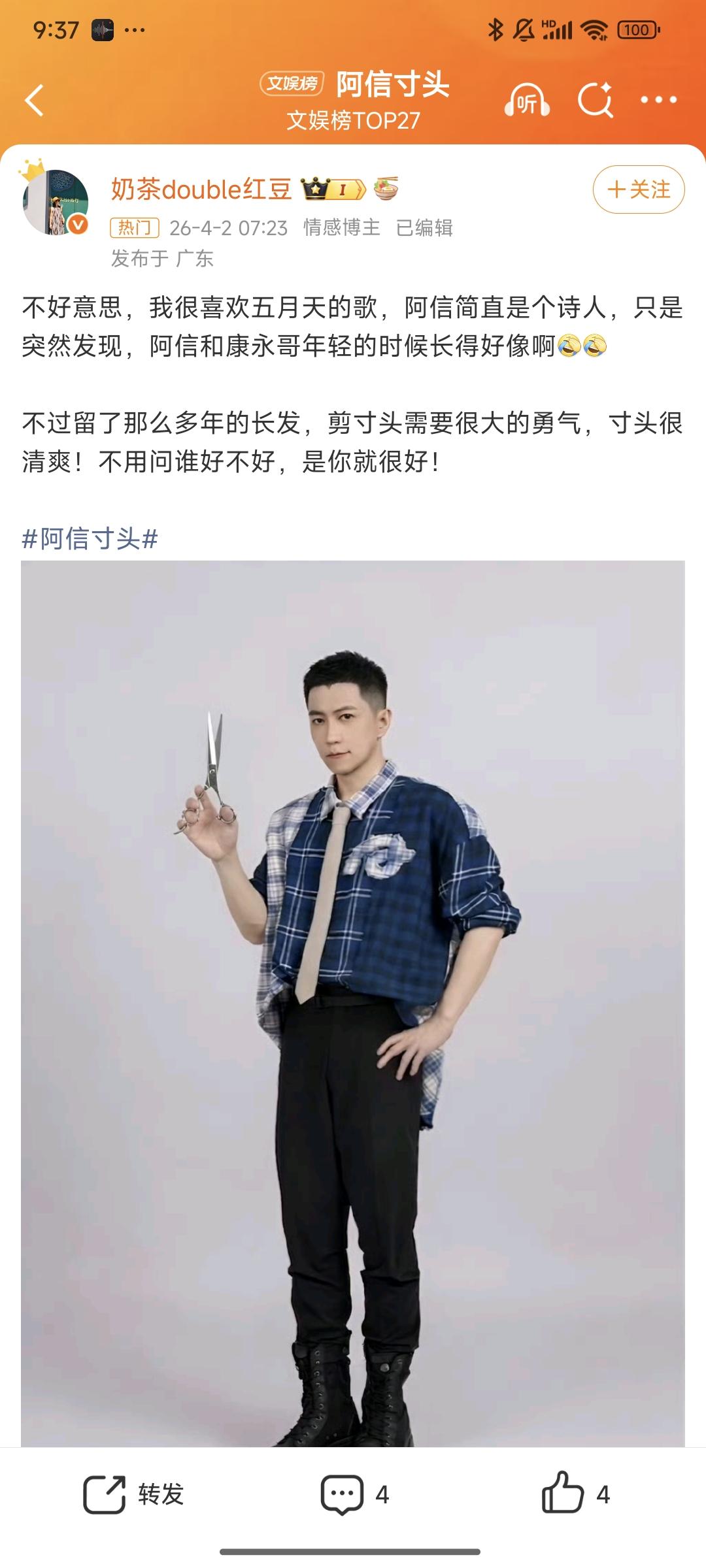 阿信,太敢了! 4月1日愚人节当天,留了20年标志性长发的阿信,突然晒出一张