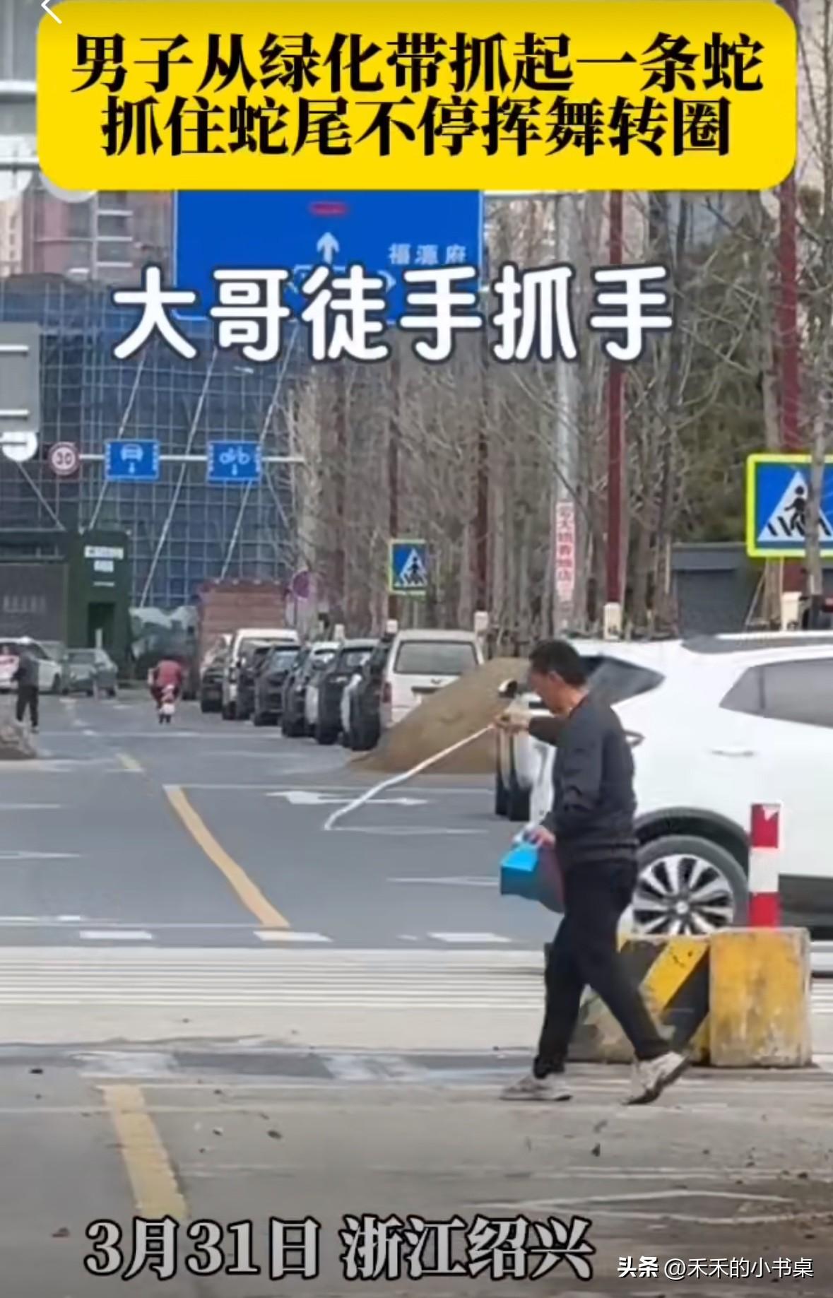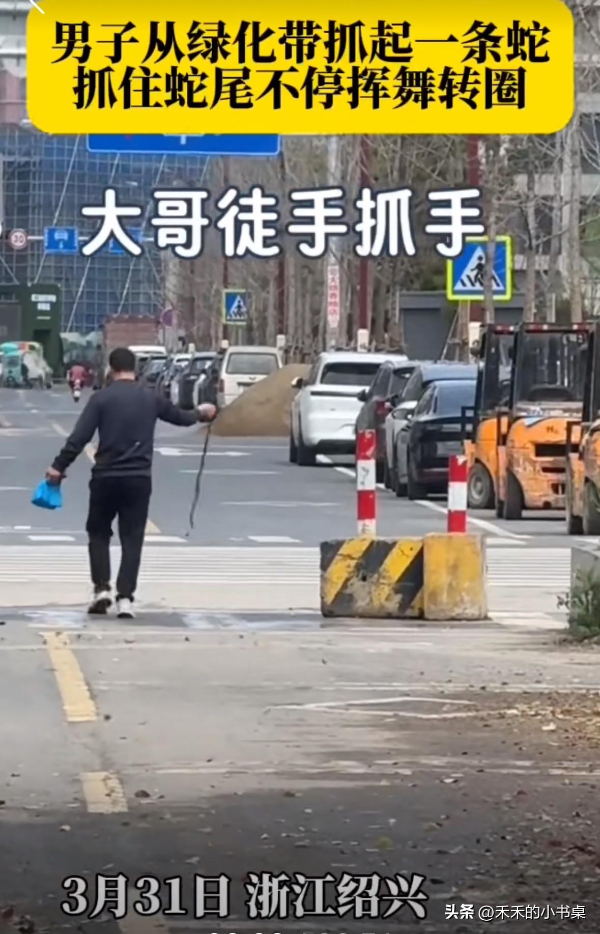 大哥从绿化带经过,看到绿化带里有条蛇,于是直接徒手抓起蛇! 然后抓着蛇尾不停的甩动,在空中转圈。 评论区说:“这样甩,蛇就瘫痪了!”不知道是真是假。 不过这位大哥真的很厉害,如果有其他路人被咬到,很可能会有生命危险。 为这位大哥点赞。绿化带里的蛇