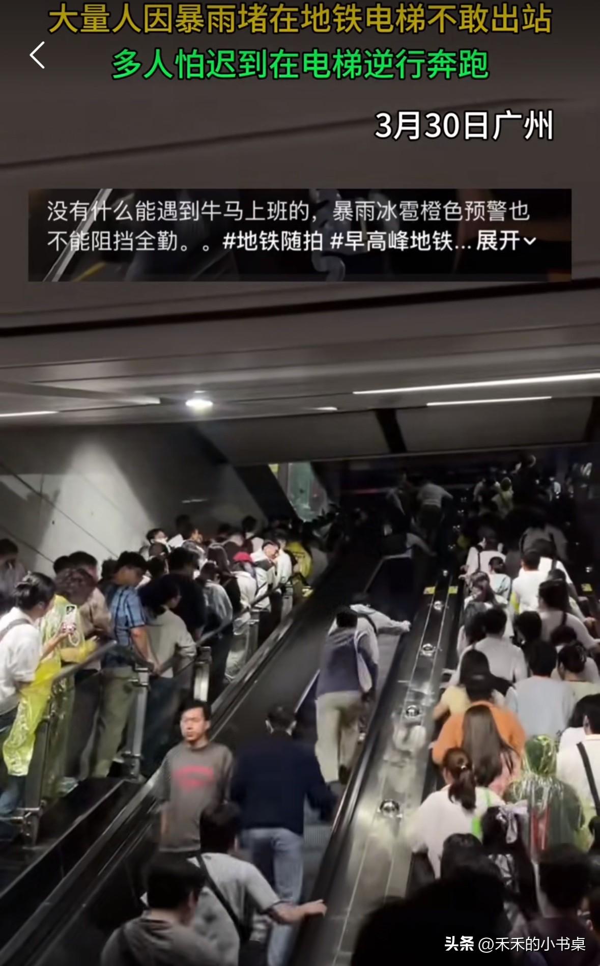 广州一地铁站,因为暴雨,很多人都被困在地铁电梯上不敢出站,也有很多人害怕迟到,于是在电梯上逆行奔跑! 没有什么能阻止牛马上班的,只要天上不下刀子,保证每个月全勤! 打工人真是太惨了,每个月为了碎银几两,真是拼命! 真是太心酸了,人为什么活的这么累。