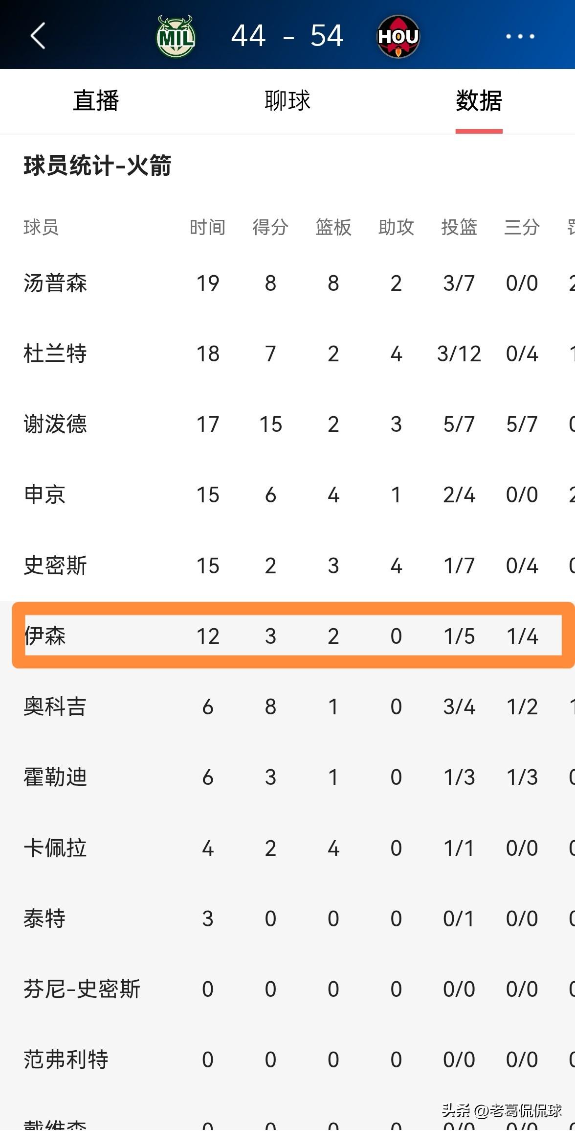 火箭大将伊森真是吃不了打替补的苦!在今天火箭主场迎战雄鹿的比赛中,目前双方半场战罢,火箭暂时以54:44领先对手10分。值得注意的是,本场比赛重回替补阵容的伊森再次陷入了低迷,他在替补出战的12分钟里,投篮5中1,其中三分球4中1相当低效的得到可怜的3分。 以目前的情况来看,伊森真是吃不了打替补的苦,只要伊森回到替补阵容,他的表现就会拉胯。