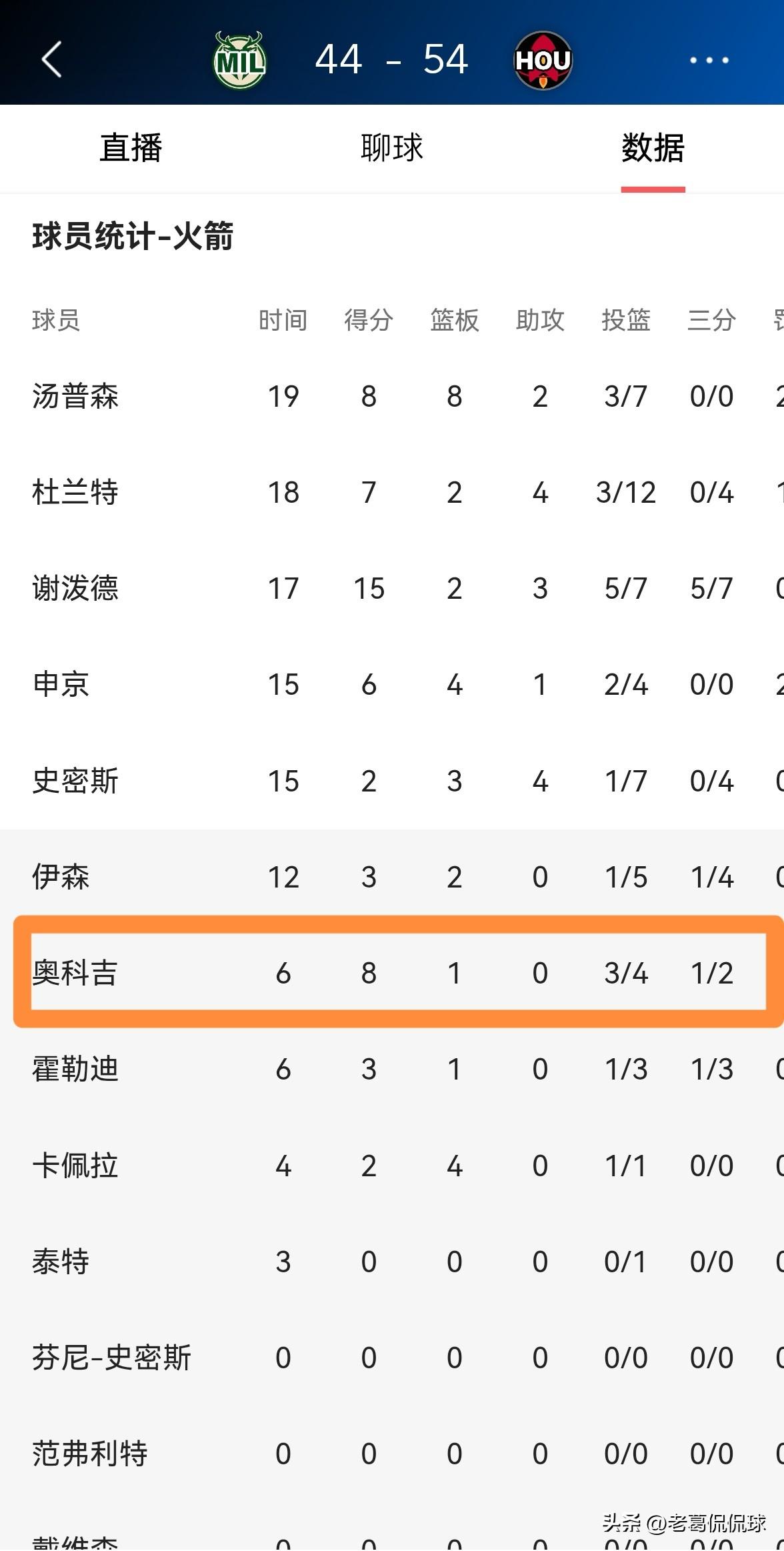 火箭悍将奥科吉真是让人眼前一亮!在今天进行的火箭和雄鹿的比赛中,目前双方的上半场比赛已经结束,火箭以54:44领先对手10分,形势看起来非常不错。值得一提的是,本场比赛奥科吉在进攻端显得非常活跃,打出了让人眼前一亮的精彩表现。 在前两节比赛中,奥科吉替补出战6分钟,投篮4中3,其中三分球2中1、罚球2中1非常高效的得到8分,还有1篮板,他的场上正负值为+2。 让人感到不可思议的是,在上半场比赛中,奥科吉奉献了一记极其炸裂的单臂暴力补扣,真的是技惊四座。