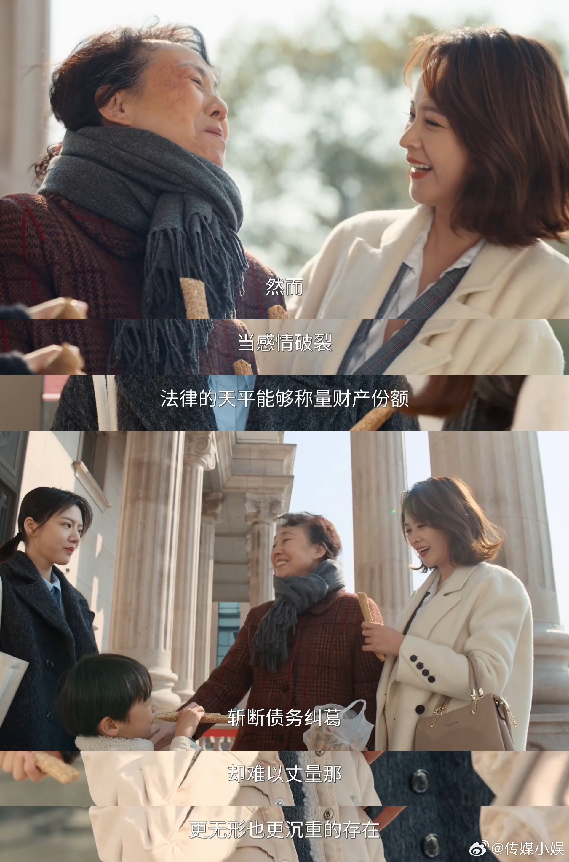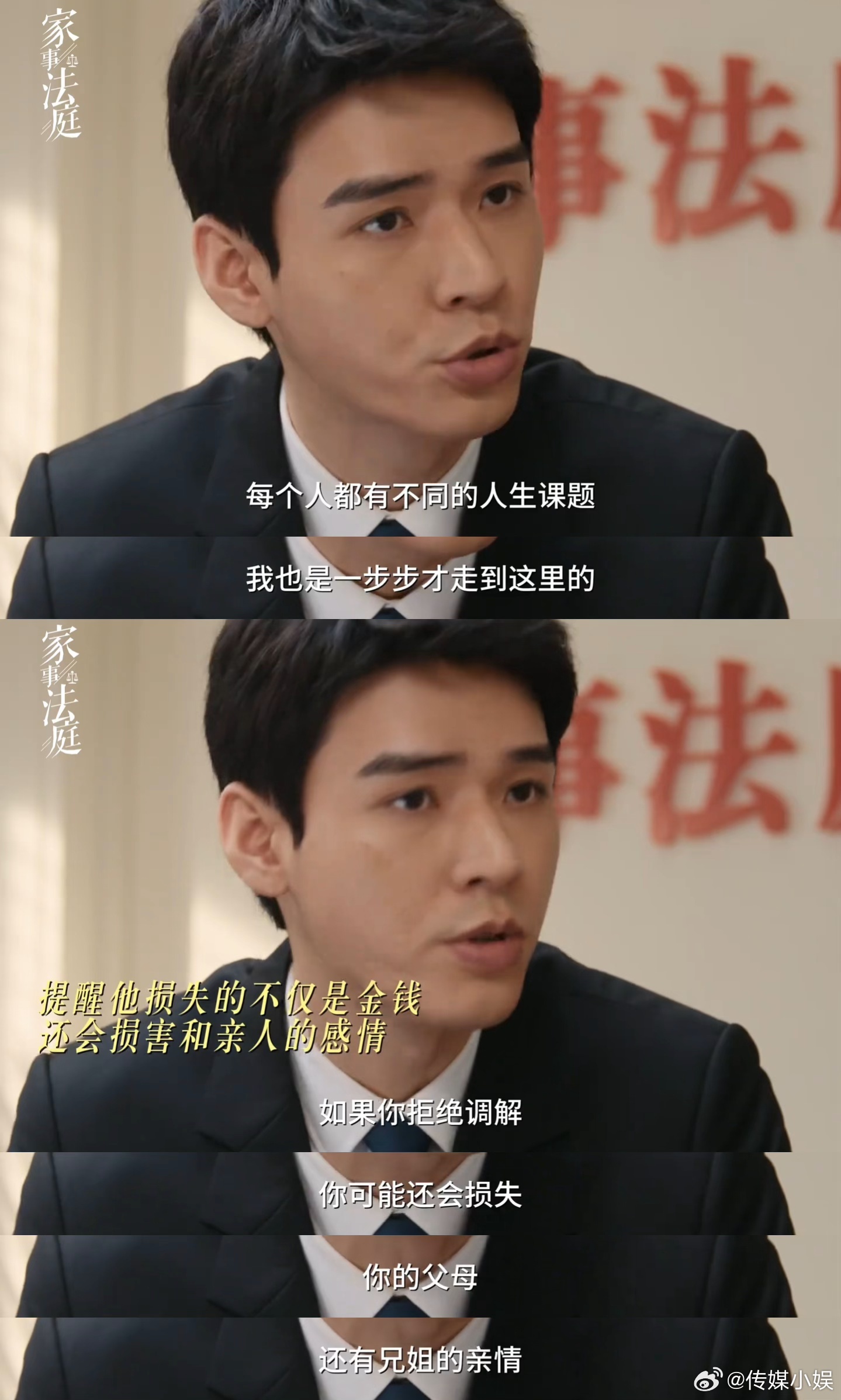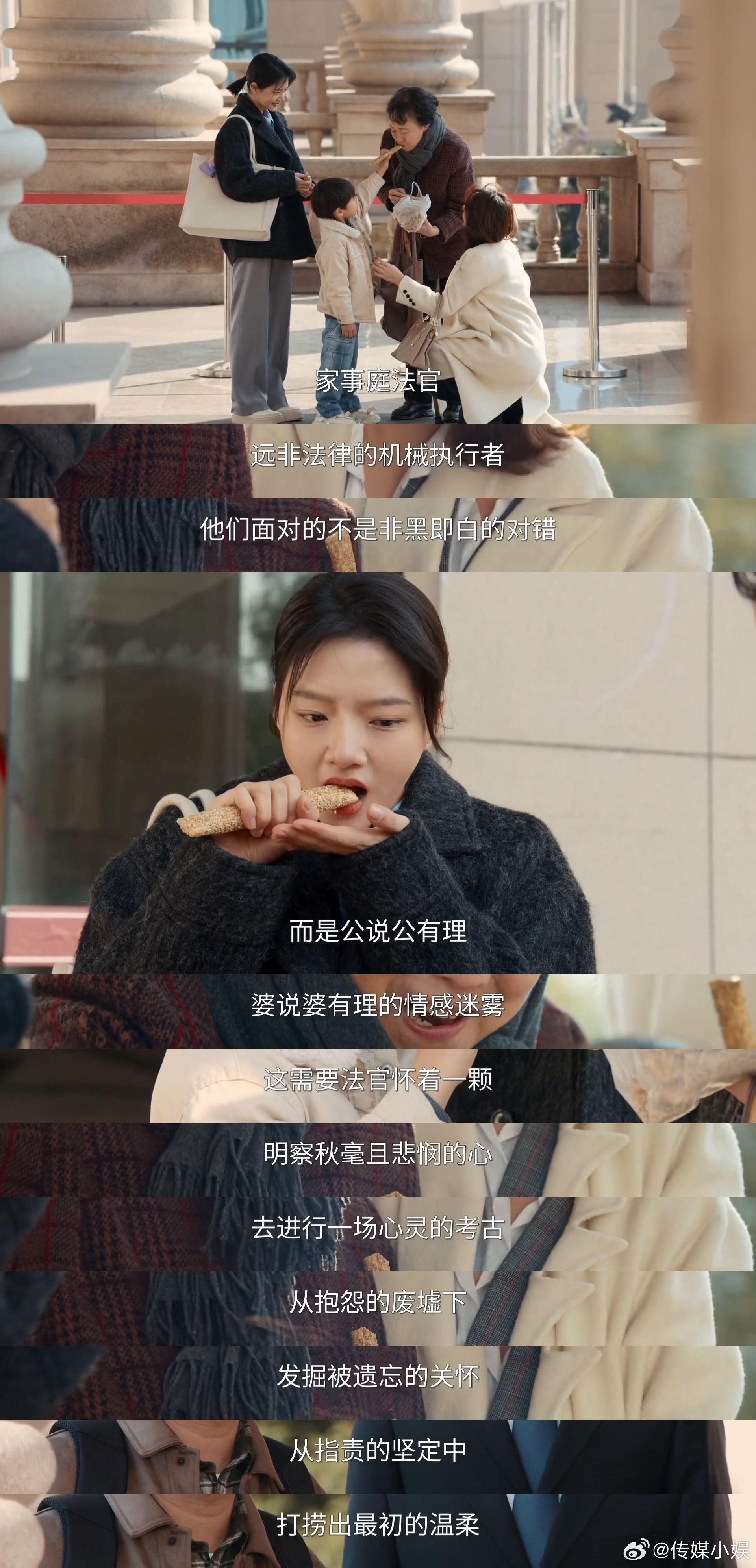 最后的最后,想用这部剧我特别喜欢的一段台词作为结尾,也能让大家更好的了解这部剧和这个职业:“家事庭法官,远非法律的机械执行者,他们面对的不是非黑即白的对错,而是公说公有理,婆说婆有理的情感迷雾。这需要法官怀着一颗明察秋毫且悲悯的心,去进行一场心灵的考古,从抱怨的废墟下,发掘被遗忘的关怀,从指责的坚定中,打捞出最初的温柔。” 家事法庭有法更有情