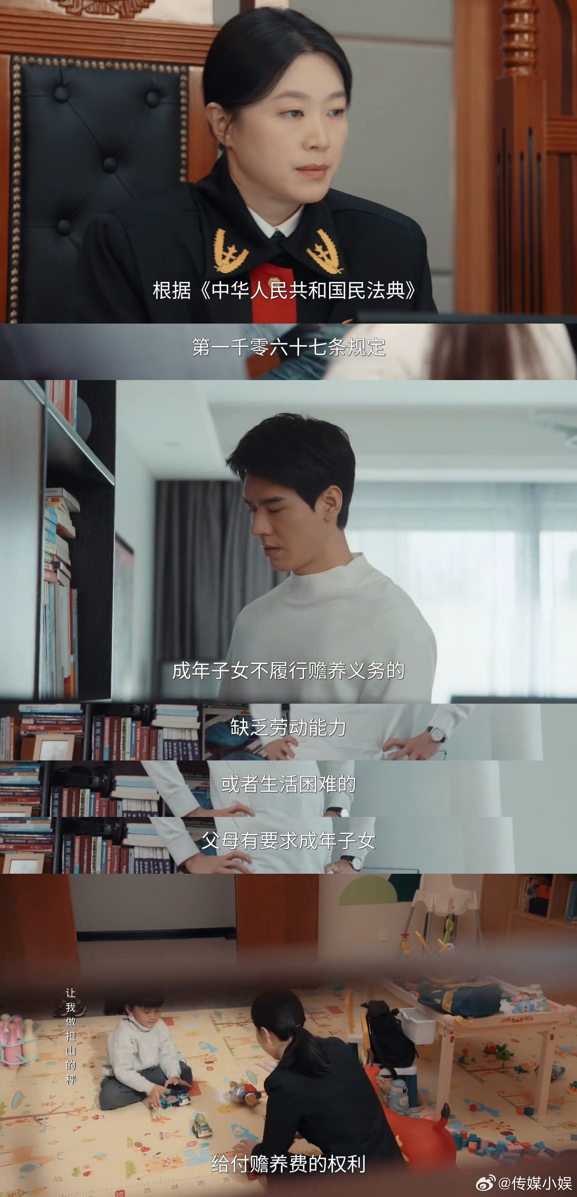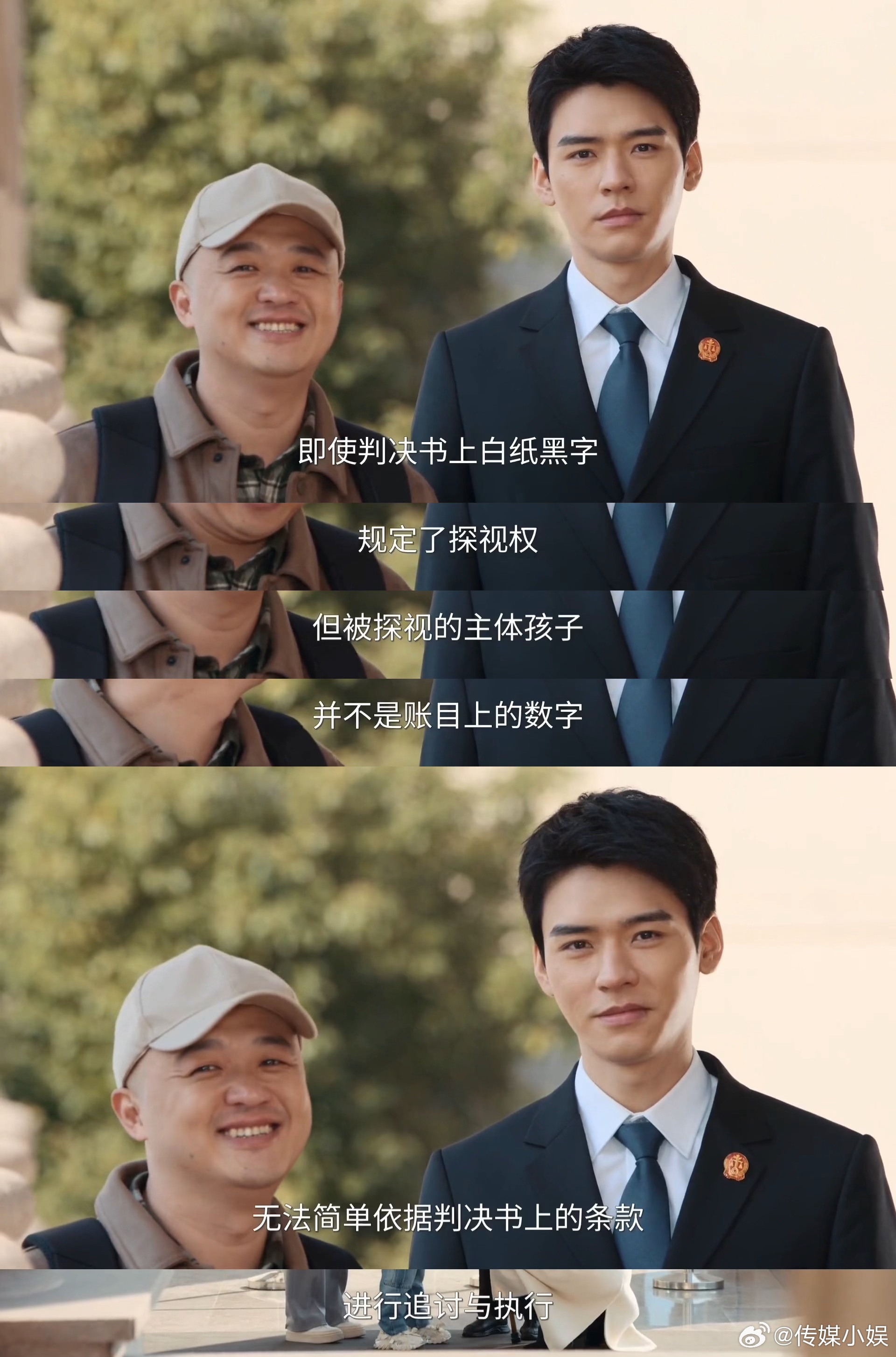 看到目前为止,我觉得这部剧给我最大的感受就是“真实”!不仅仅是这部剧里的“案件”都来源于真实的事件,更多的是“案件”背后所反映的一些社会现象,比如争抚养权却忘了爱孩子的父母,上一秒封号前还在为了热度直播“抢”孩子,结果下一秒号被封之后就都不要孩子了……再比如“父亲病危求儿子捐肾,儿子恶语相向”,就是我在看的同时也会代入到法官的角色中,设身处地的去想如果是我,我该怎么去调解和判决,会不会有更好的解决方案呢?