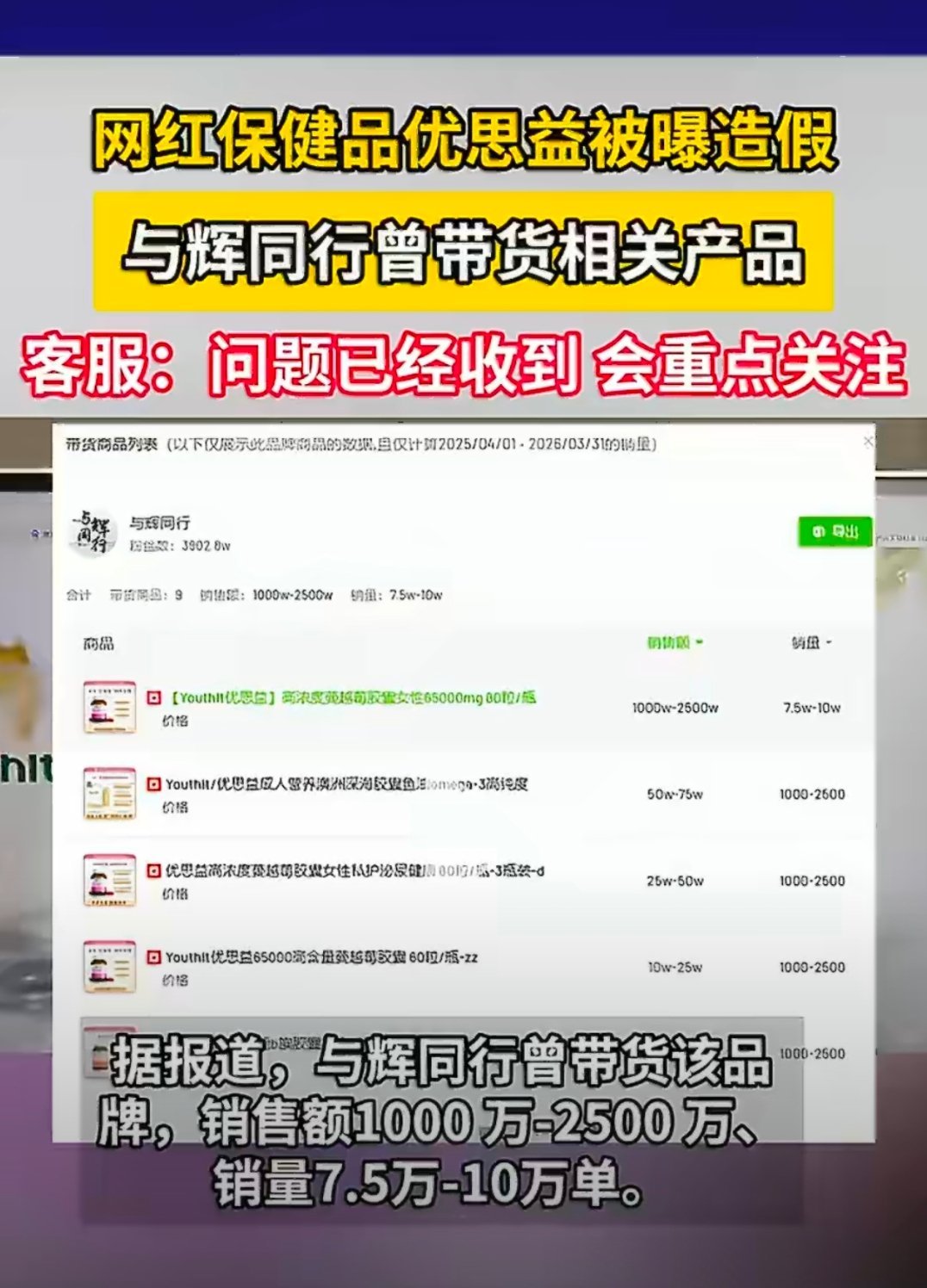与辉同行卖优思益销售额超千万你说,这些大主播不都是宣称的选品有多么多么严格么?这优思益突然的暴雷,地址是假的、故事编的、大奖买的、专家网红雇的!这些带过货的主播是会继续嘴硬呢还是老老实实的退一赔三呢?与辉同行客服回应带货优思益