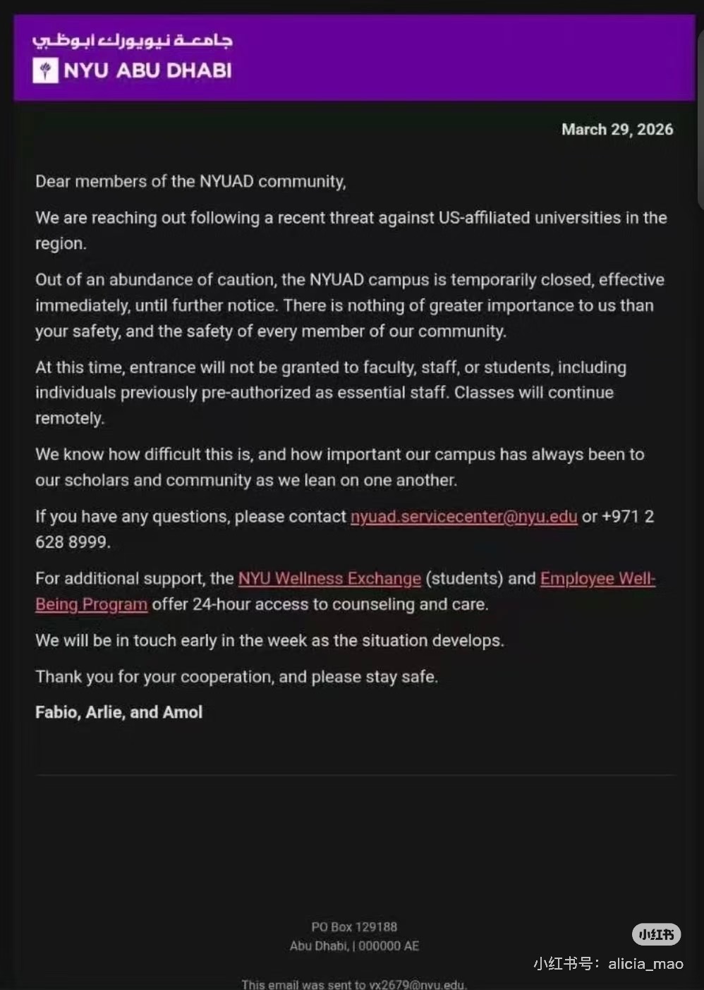 谁成想当初大家最憧憬的nyuad,因为美以伊冲突要暂时关闭了,甚至学校包飞机让大家撤