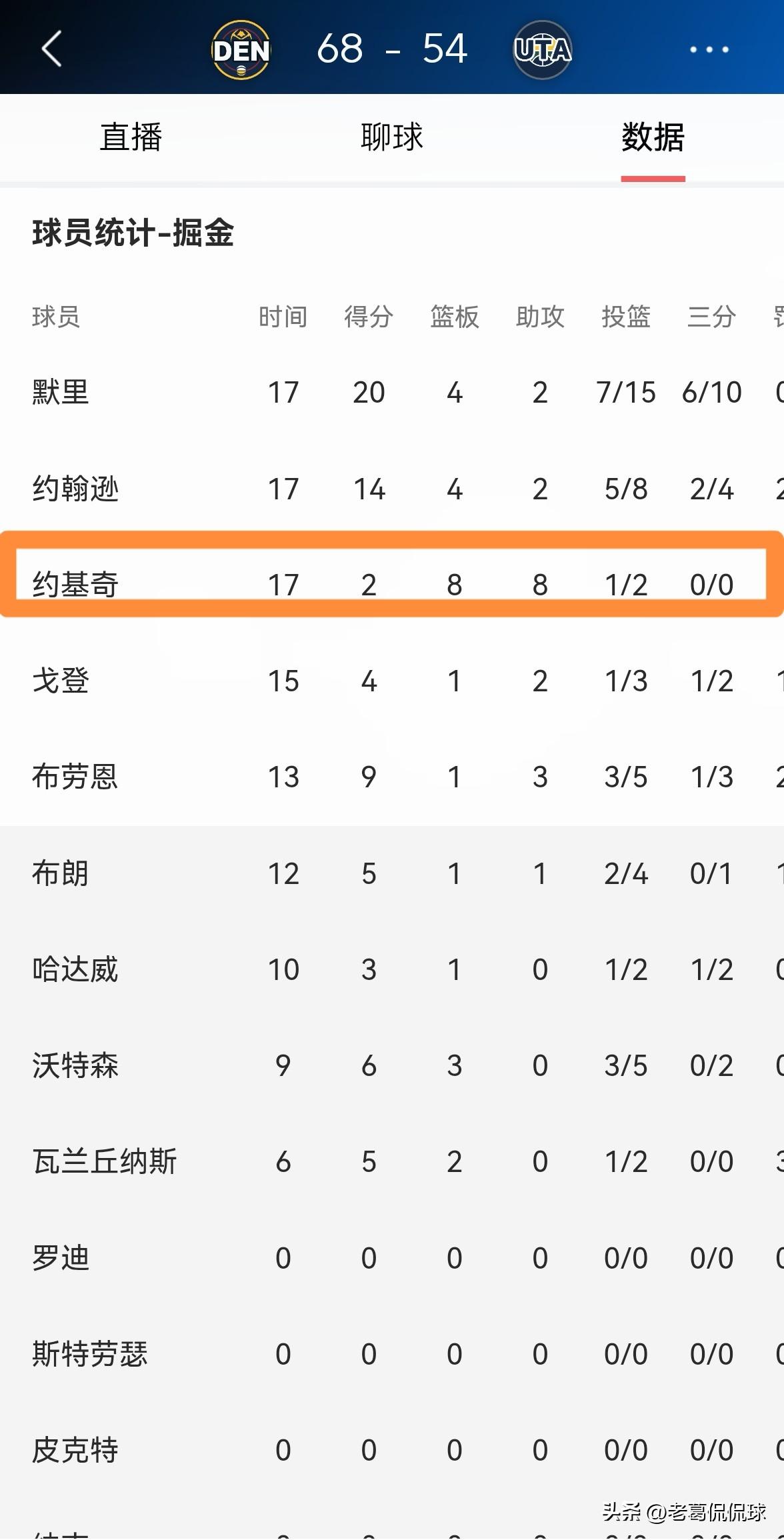 掘金巨星约基奇真是太懂人情世故了!在今天掘金客场挑战超级弱旅爵士的比赛中,目前双方半场战罢,掘金以68:54领先对手14分。值得一提的是,在前两节比赛中,约基奇毫无得分欲望,他将自己的主要精力放在了组织串联方面,他在首发出战的17分钟里,投篮2中1仅仅得到2分,不过有8篮板8助攻,他的场上正负值为+9。 老实说,约基奇实在是太懂人情世故了,他深知爵士的实力比较弱,因此约基奇克制了自己的得分欲望,不然的话掘金起码会以20分的领先优势结束前两节的比赛。