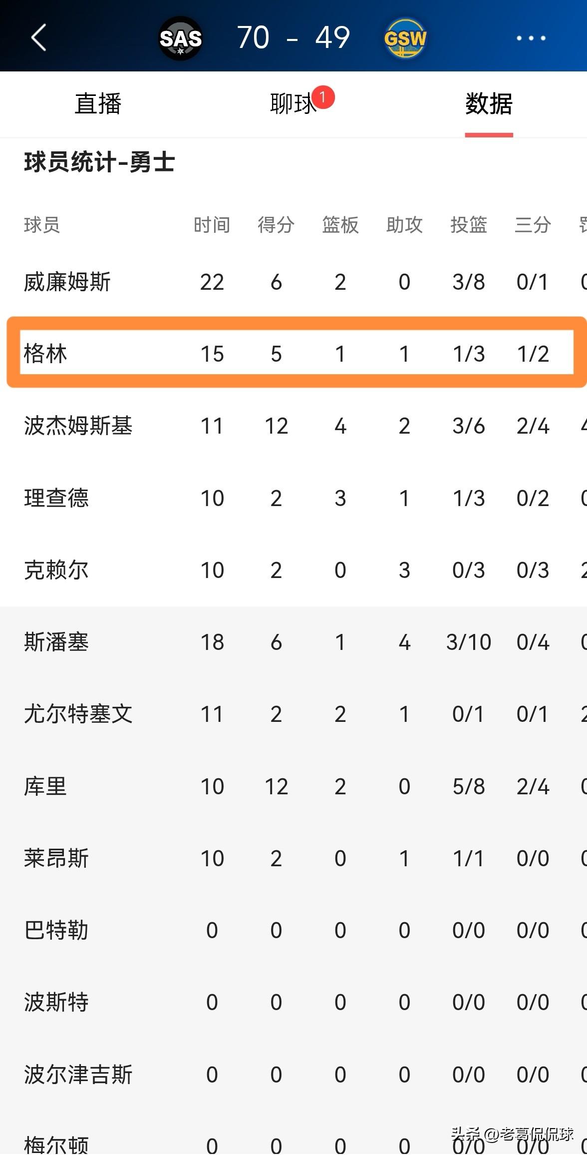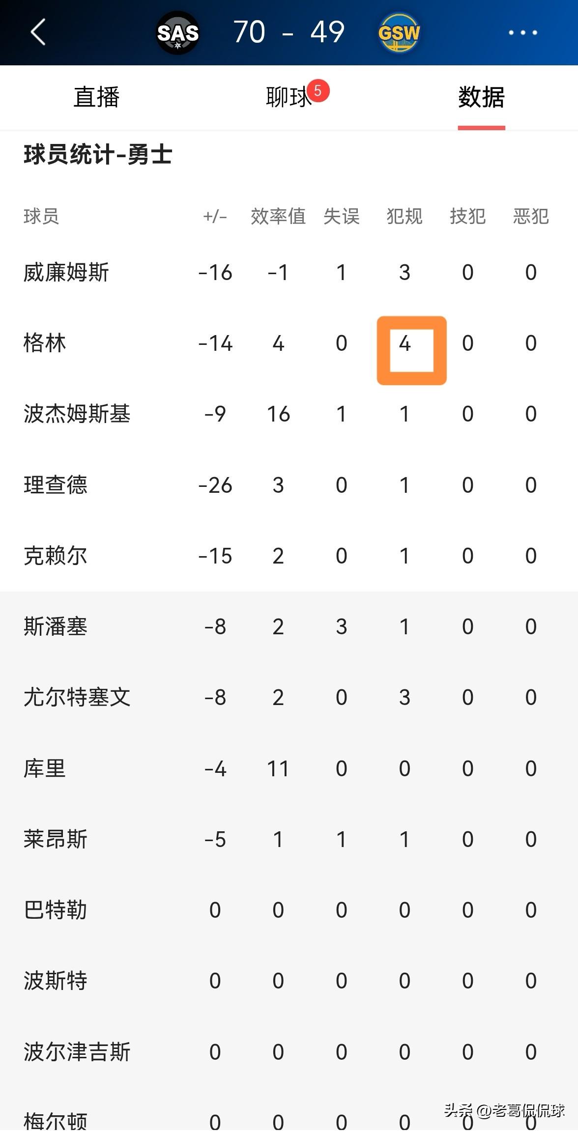勇士恶汉追梦格林又不想好好打球了!在今天勇士主场迎战马刺的比赛中,目前双方半场战罢,勇士以49:70落后对手21分,形势看起来非常的糟糕。在前两节比赛中,追梦格林首发出战15分钟,投篮3中1,其中三分球2中1、罚球2中2得到5分,还有4次犯规,他的场上正负值为-14。 说实话,当一名球员的犯规数接近他的得分时,这足以说明这名球员不想好好打球,追梦格林就是如此。