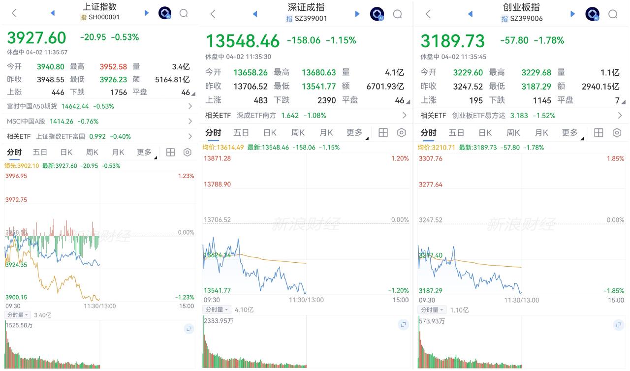开盘:沪-0.20%、深-0.35%、创-0.55%。