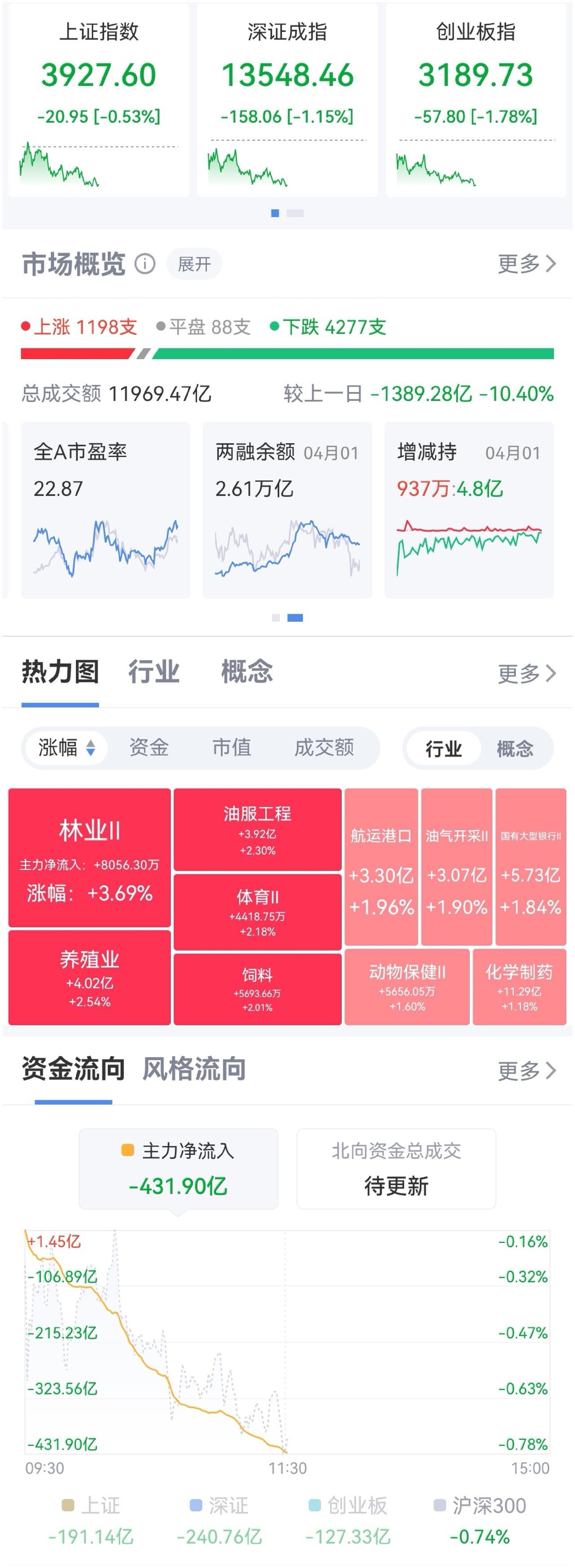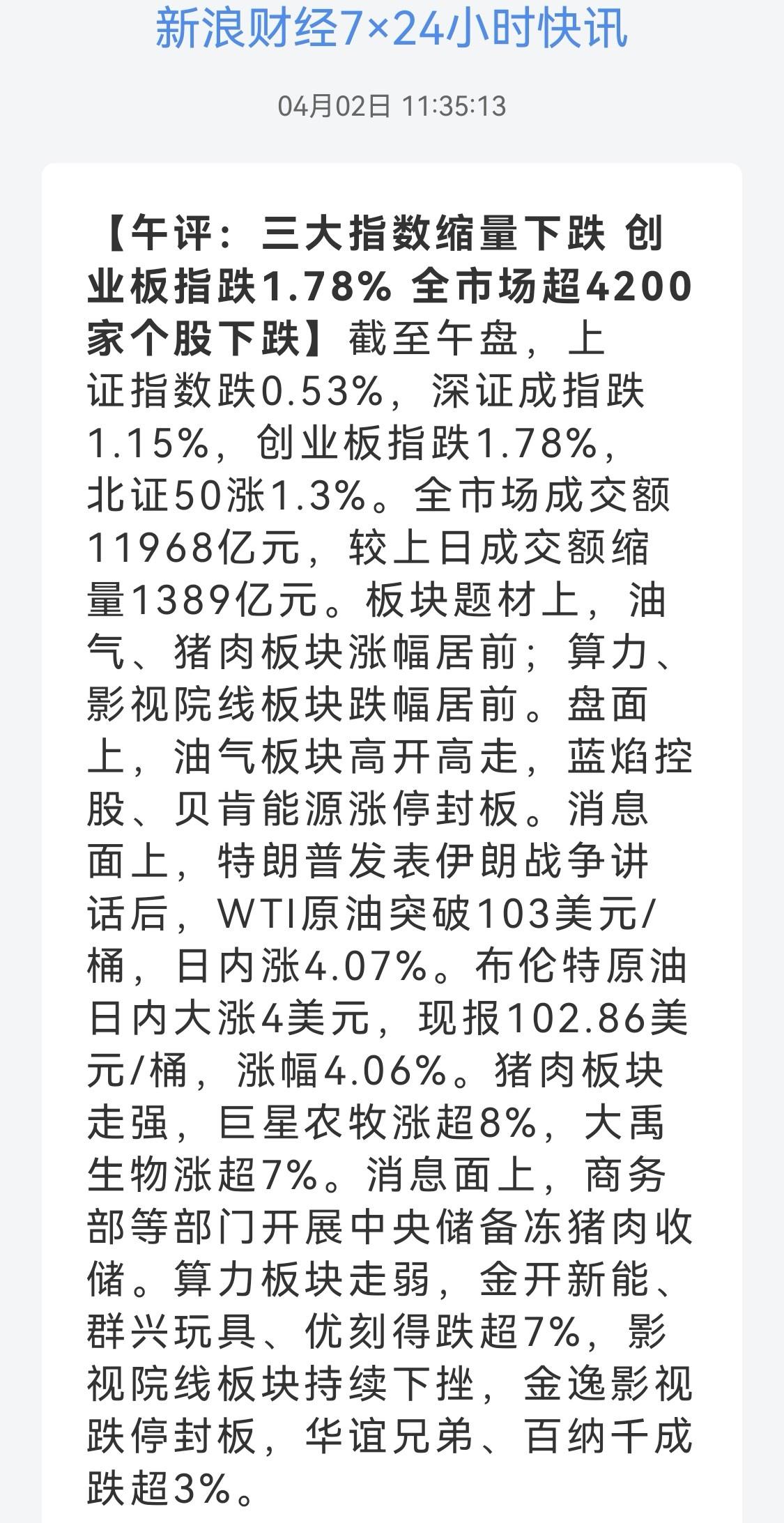 午盘:沪-0.53%、深-1.15%、创-1.78%。