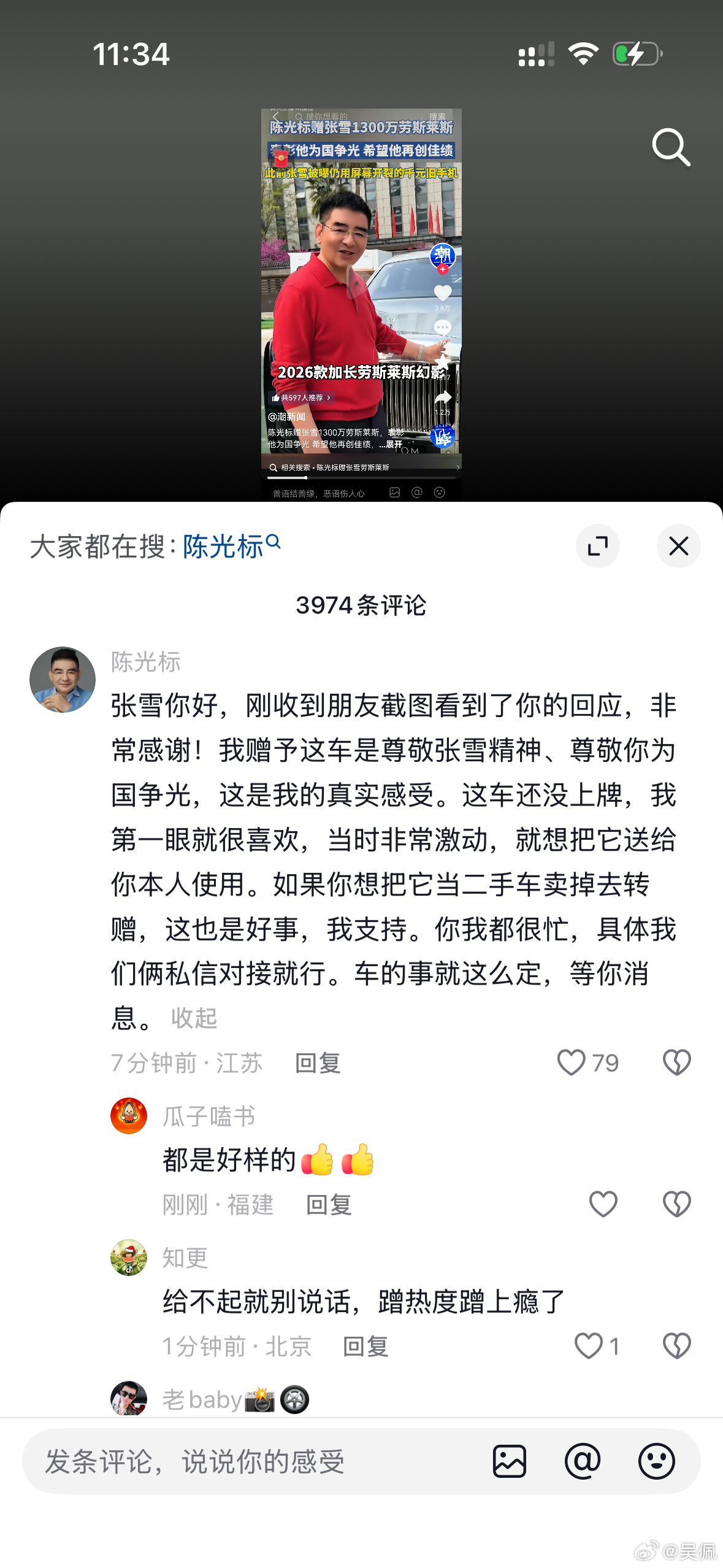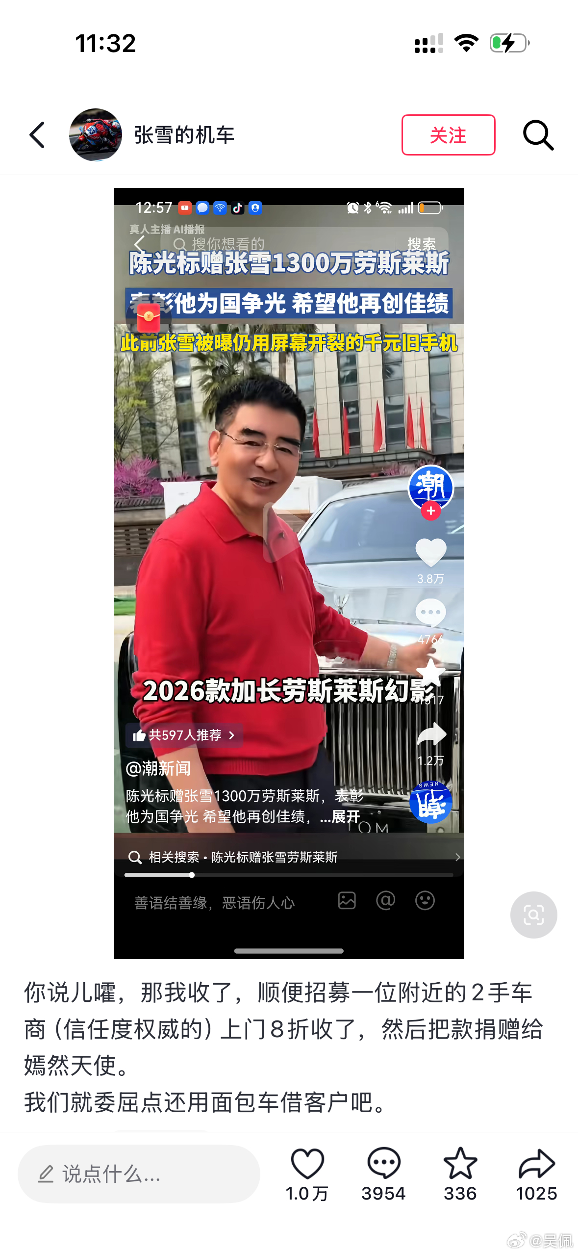 陈光标喊话张雪,让他联系他。只要他同意,就把自己价值1300万的劳斯莱斯送给他,