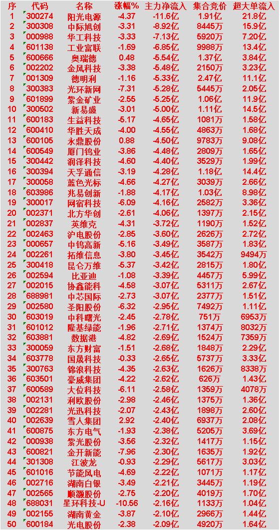 4月2日上午盘,主力趁低位,大幅买入50名单: 中超控股:涨幅 7.71%,主力净流入 11.5 亿 中利集团:涨幅 9.93%,主力净流入 10.3 亿 新能泰山:涨幅 9.98%,主力净流入 5.06 亿 胜宏科技:涨幅 1.75%,主力净流入 4.79 亿 亨通光电:涨幅 5.06%,主力净流入 4.08 亿 4月2日中午收盘,主力资金“大幅卖出”的50名单: 阳光电源:跌幅 4.37%,主力净流出 11.6 亿 中际旭创:跌幅 3.31%,主力净流出 8.92 亿 华工科技:跌幅 3.33%,主力净流出 7.13 亿 工业富联:跌幅 1.69%,主力净流出 6.85 亿 奥瑞德:涨幅 0.48%,主力净流出 5.54 亿