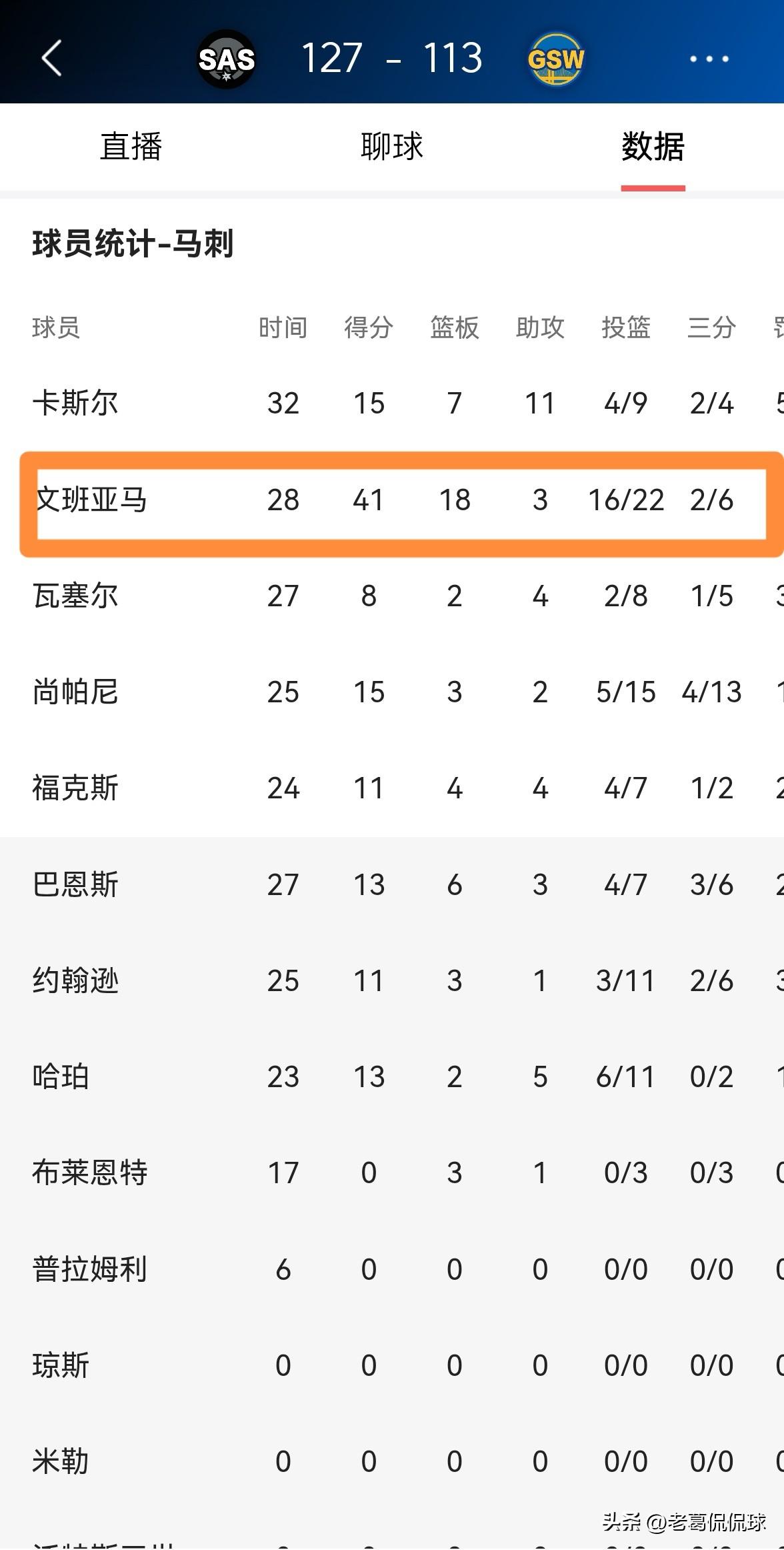 马刺超级巨星文班亚马真是太狠心了!在今天马刺客场以127:113轻取勇士的比赛中,文班亚马面对残阵勇士毫不留情爆砍41分,几乎凭借一己之力把勇士打得屁滚尿流。 全场比赛下来,文班亚马仅仅首发出战28分钟,投篮22中16,其中三分球6中2、罚球8中7狂轰41分18篮板,外加3助攻3盖帽,他的场上正负值为+16。 值得一提的是,本场比赛勇士巨星库里亲眼目睹了文班亚马的炸裂表现,我相信等库里伤愈复出以后,库里一定会向马刺和文班亚马复仇。