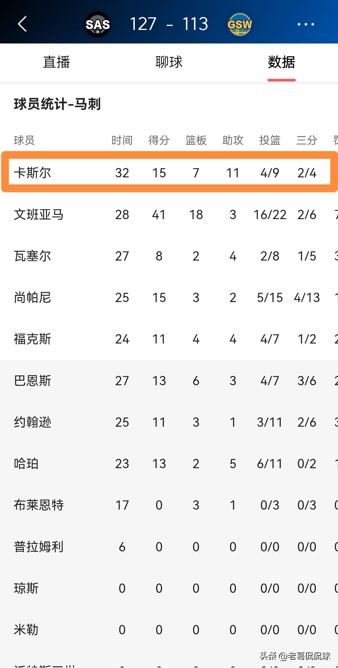 马刺新星卡斯尔的传球能力真是不容小觑!在今天马刺客场以127:113战胜勇士的比赛中,卡斯尔的助攻数再次上双,展现出了非常出色的传球能力。 整场比赛下来,卡斯尔首发出战32分钟,投篮9中4,其中三分球4中2、罚球7中5砍下15分7篮板11助攻1抢断,他的场上正负值为+6。 实事求是的说,如果卡斯尔能够提高自己在组织串联方面的稳定性,那么卡斯尔绝对能够成长为一名全明星级别的后卫,他和文班亚马的组合真是让人充满了期待和幻想。