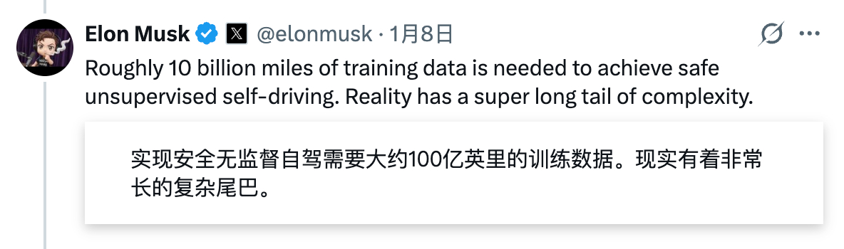 不过,Elon 并未展开解释这个数字是怎么来的,只能理解为他基于彼时 FSD v14 的模型性能的推测。