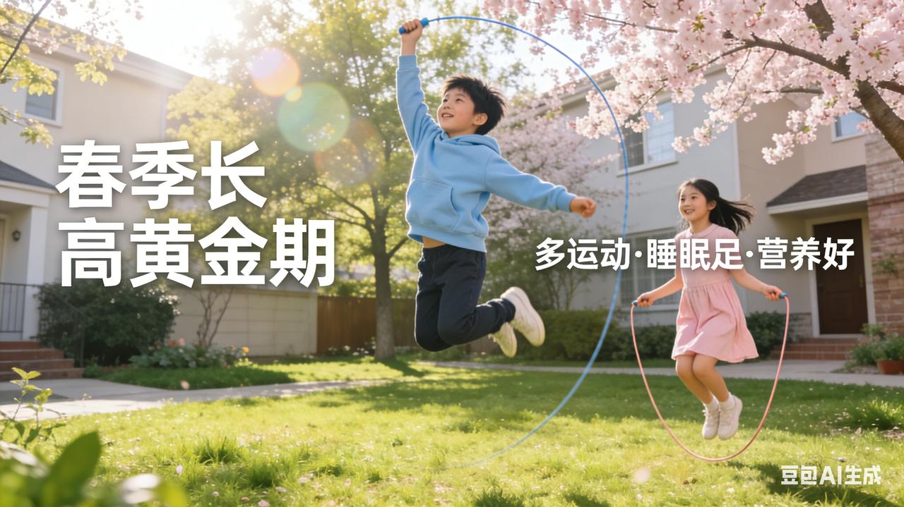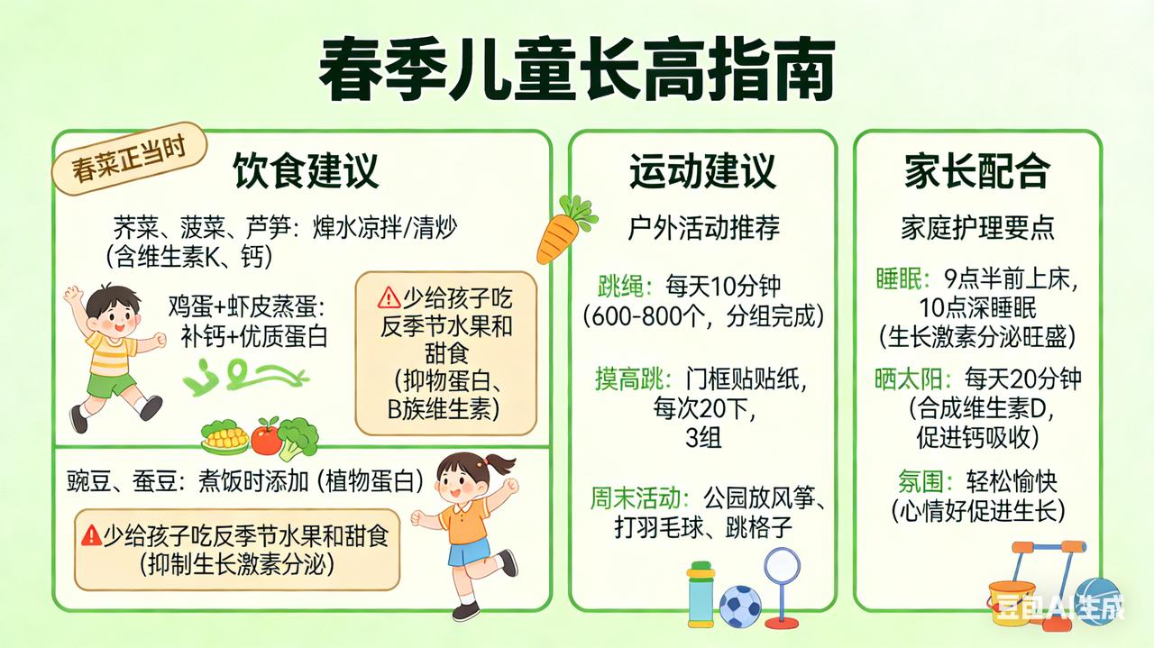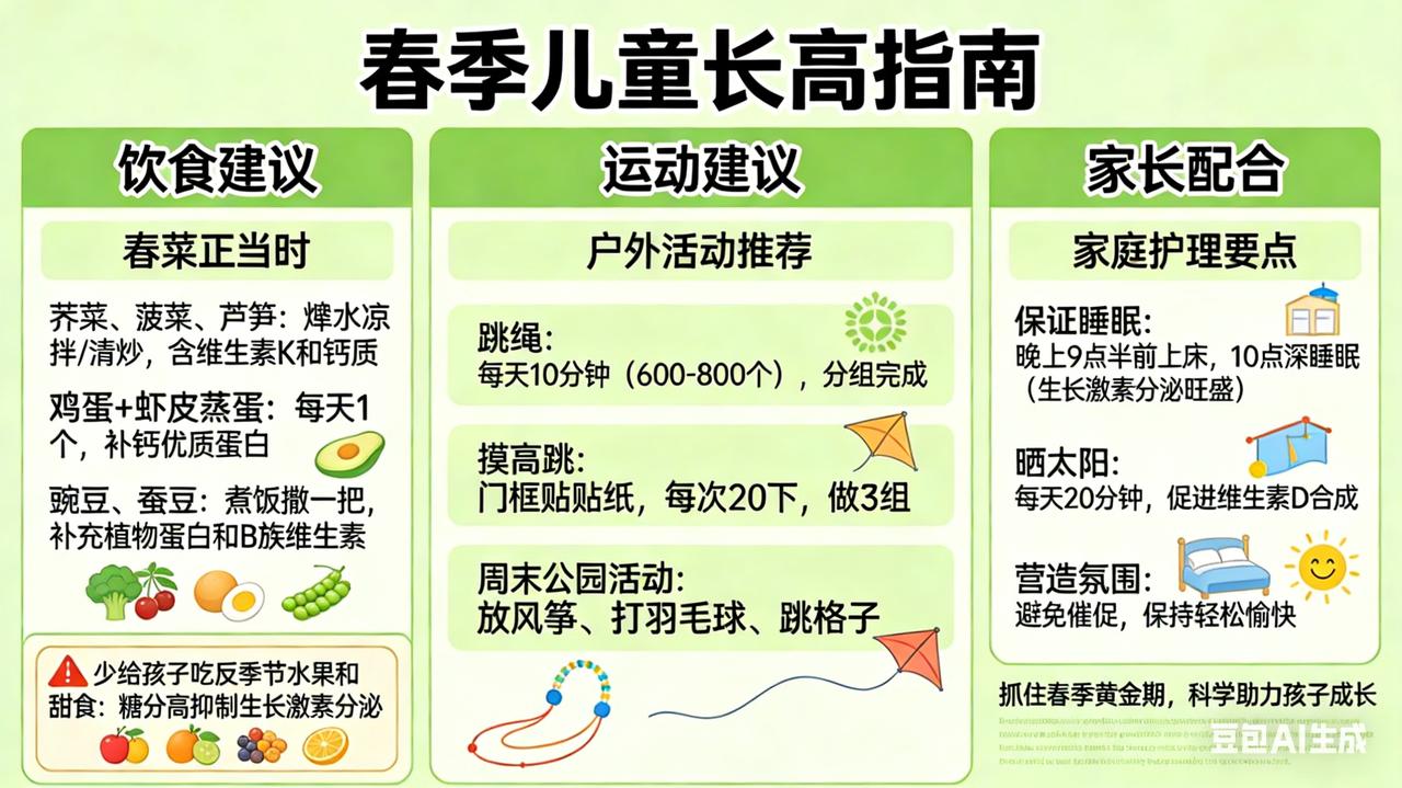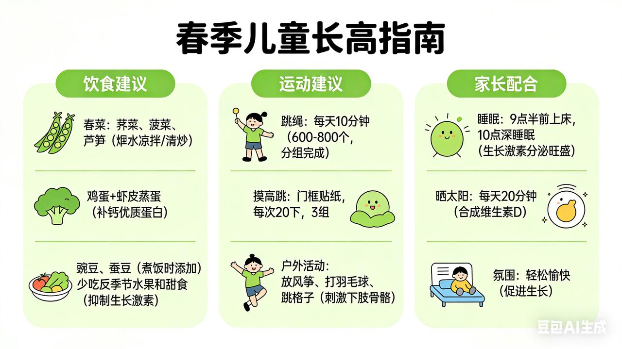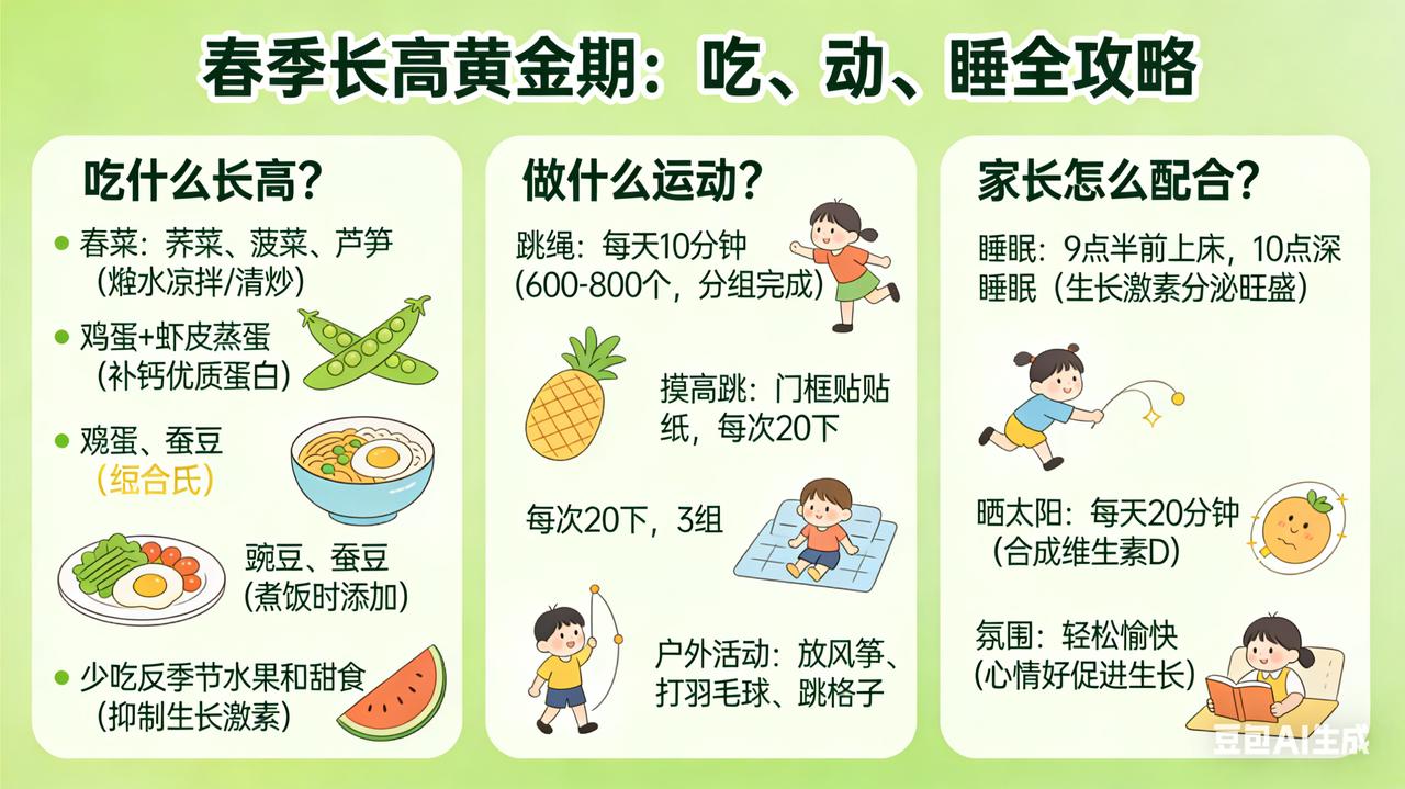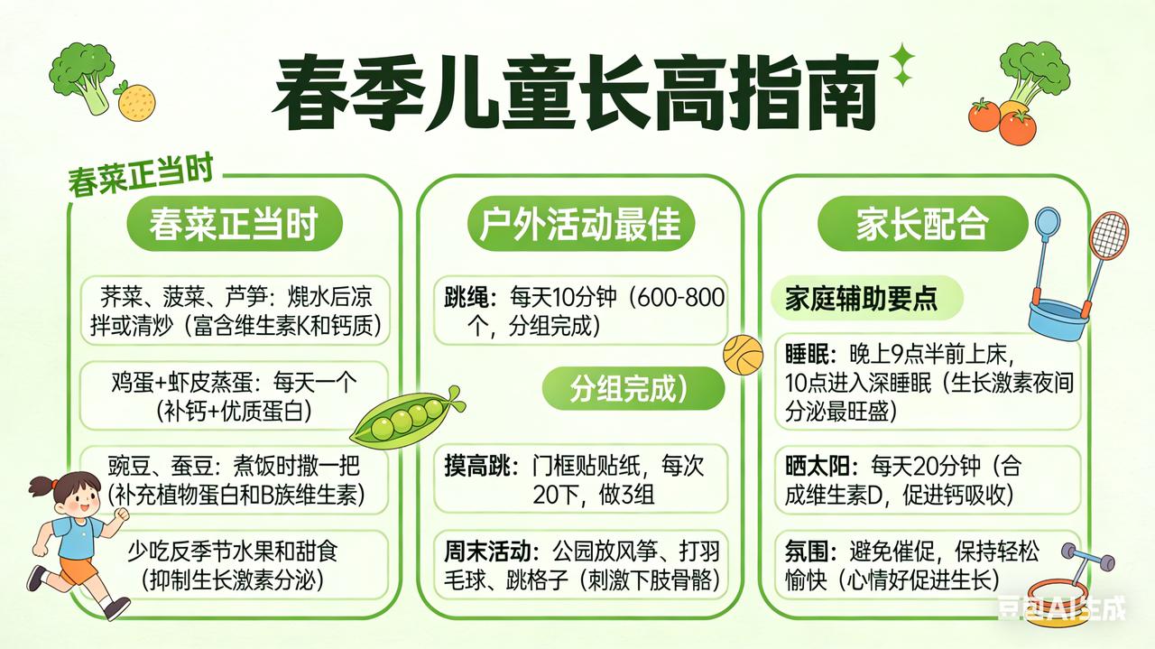 春节做对,身高翻倍 春天是万物生长的季节,也是孩子一年中长高最快的“黄金窗口期”。抓住这三个月,比补什么都管用。 春天吃什么长高? 春菜正当时:荠菜、菠菜、芦笋富含维生素K和钙质,焯水后凉拌或清炒。鸡蛋每天一个,配上虾皮蒸蛋,补钙又优质蛋白。豌豆、蚕豆当季鲜嫩,煮饭时撒一把,补充植物蛋白和B族维生素。少给孩子吃反季节水果和甜食,糖分高了会抑制生长激素分泌。 做什么运动长高? 春天适合户外活动:跳绳是“长高第一运动”,每天跳10分钟(600-800个),分组完成。摸高跳——在门框贴个贴纸,让孩子跳起来去拍,每次20下,做3组。周末带孩子去公园放风筝、打羽毛球、跳格子,边玩边刺激下肢骨骼。 家长怎么配合? 第一,保证晚上9点半前上床,10点进入深睡眠——生长激素夜间分泌最旺盛。第二,周末多带孩子晒太阳,每天20分钟,帮助身体合成维生素D,促进钙吸收。第三,别总催促“快长高”,给孩子轻松愉快的家庭氛围,心情好了,身体自然跟着长。