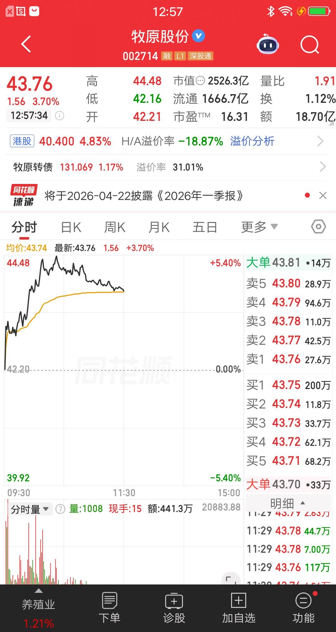 江西的一位散户今天梭哈了牧原股份,大概43元的成本买了50万元。他买完以后就在社