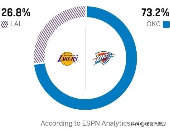 ESPN真是太不尊重湖人三巨头了!明天湖人将会在客场挑战卫冕冠军雷霆,今天ESPN对于这场强强对话进行了一番预测,结果着实让人大吃一惊,ESPN竟然预测湖人获胜的概率仅有可怜的26.8%,远远低于雷霆的73.2%。 毫不客气的说,ESPN实在是太不尊重由詹姆斯领衔的湖人三巨头了。虽然雷霆的实力非常强大,且拥有主场优势,但是湖人的赢球概率绝对不至于这么低,只要湖人三巨头能够发挥出色,那么湖人完全有希望在客场击败雷霆。
