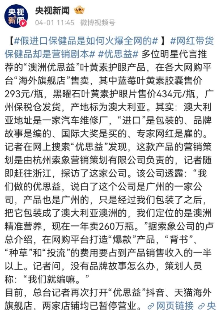 炸锅了!央视出手,优思益背后营销公司被立案,大快人心🤬 不是偶然,是罪有应得! 靠造假、靠忽悠、靠收割,终究栽了! 央视实锤曝光,每一个细节都恶心到骨子里! 先给大家扒个底朝天,不服来辩! 大家刷到的“澳洲优思益”,号称进口保健品。 吹得天花乱坠,护眼、养生,一瓶卖几百块。 明星代言,网红种草,全网都是推广。 一年卖260万瓶,赚得盆满钵满! 可谁能想到,全是假的! 背后操盘手,就是杭州索象营销策划公司。 也就是优思益的营销推手! 他们亲口炫耀,毫无遮掩: “优思益就是广州生产的,我们包装成澳洲品牌。” 说白了,就是花钱买个“进口马甲”! 更离谱的是,产品连保健品资质都没有。 按规定,保健品必须有“蓝帽子”标识。 可优思益包装上,连个蓝帽子的影子都没有。 却天天打着保健的擦边球,收割消费者! 成本8块钱,竟敢卖到400块! 这哪里是卖产品,分明是抢钱! 更恶心的是他们的营销套路。 雇明星代言,花巨资刷种草笔记。 把海外地址编造成生产工厂,实则是汽修站。 平台审核睁一只眼闭一只眼。 他们靠着这套骗局,赚得盆满钵满。 而消费者,花了冤枉钱,还以为买了进口好货。 有人嘴硬:营销公司都这样,没必要上纲上线。 放屁!这不是普通营销,是欺诈! 是拿着消费者的信任,往死里坑! 多少老人、宝妈,为了养生、护眼。 省吃俭用,买这几百块一瓶的“智商税”。 他们的血汗钱,就这样被骗子装进腰包! 好在,央视曝光后,监管部门立马出手。 杭州市场监管部门快速行动。 调取合同、核查资金往来,问询负责人。 现已正式对优思益营销策划公司立案调查! 与此同时,优思益各大平台旗舰店被禁言、产品下架。 涉案仓库被抽检,相关人员被调查。 大快人心!终于轮到他们付出代价了! 这起案件,给所有虚假营销公司敲了警钟: 别以为靠造假、靠忽悠就能赚快钱。 别以为钻监管漏洞,就能逍遥法外。 消费者的眼睛是雪亮的,监管的利剑从未收起。 也给所有明星、网红提个醒: 别为了暴利,代言虚假产品。 别透支自己的口碑,收割粉丝信任。 否则,一旦翻车,身败名裂,还要承担法律责任! 更要给平台敲警钟: 审核不是走过场,责任不能当摆设。 别再放任虚假宣传、假冒伪劣产品横行。 守住底线,才能守住消费者的信任! 315只有一天,但消费者的权益,不该只在315被重视。 优思益营销策划公司被立案,只是开始。 愿监管部门加大查处力度,斩草除根。 严查所有虚假营销、假冒进口的骗局。 还市场一片清明,还消费者一个公道! 优思益营销策划公司被立案调查 看完太解气了!你买过优思益的产品吗?你觉得该重罚虚假营销公司吗?