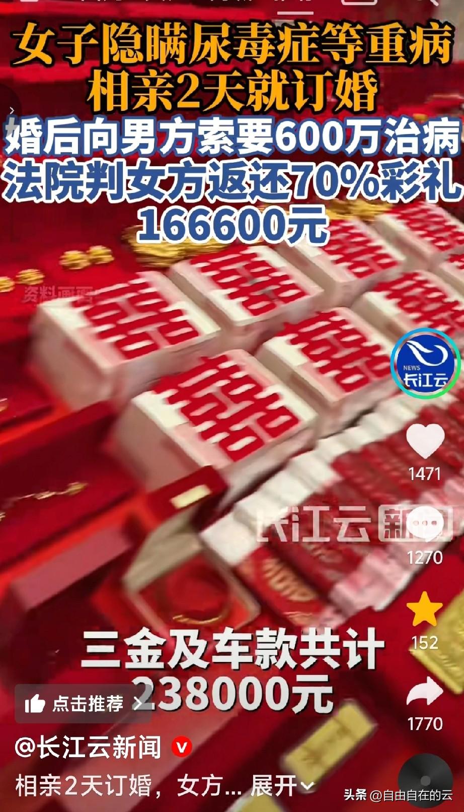 这是把男方当冤大头了吗? 男子和女子相亲认识,认识两天后就订婚了,男方给了女方彩礼总共238000。之后两人举行了婚礼并且同居了,但是并未领证。 之后不久女方就因为尿毒症等多种重病去住院了,女方要求男方贷款600万给她治病。男方这才知道女方早就知道自己有病,所以男方不仅拒绝,还要求女方返还彩礼。女方直接拉黑男方。 男方只好去法院起诉,法院判决女方返还彩礼的70%,退还166000的彩礼。 有网友就说了,既然女方知道自己有病并隐瞒了,这不应该属于骗婚吗?应该全部返还。 有网友说,男方也有责任,他没有做婚检,如果做了婚检就不会发生这样的事了。 反正我不赞成闪婚,为什么有些人认识两三天就订婚、结婚,你了解这个人吗?这很容易为以后的婚姻埋下隐患,这个男子,也算花钱买个教训。 对于这件事,你怎么看呢?