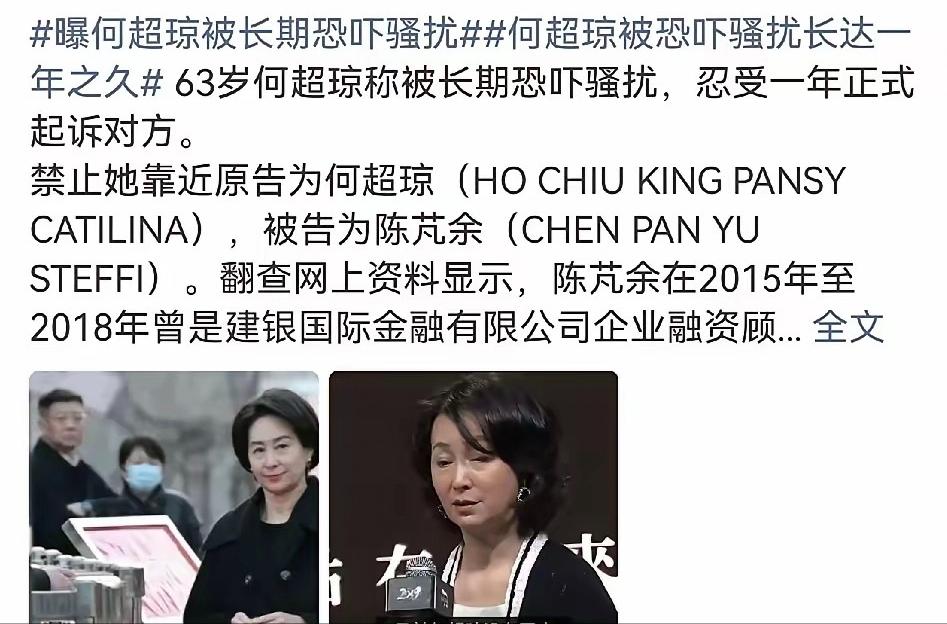 何超琼,不再隐忍! 3月31日晚上,赌王大女儿何超琼,突然冲上热搜,这次她无论如何也忍不了了,直接把前证监会持牌代表陈芃余,告上了香港高等法院 。 事情其实很简单,也很令人气愤,陈芃余对何超琼的骚扰,已经持续了整整一年,从2025年3月开始,就没停过,一步步把这位商界女强人逼到了绝境。 陈芃余曾经是香港证监会的持牌代表,2015年到2018年还在知名金融机构建银国际任职,做过企业融资顾问、证券顾问,本该是懂法守法、明辨是非的人,可她却做出了连普通人都不齿的骚扰行为。 她没有任何正当理由,就开始对何超琼死缠烂打,不光用电话、邮件轮番轰炸,还跑到何超琼的公司办公楼外长期蹲守,偷偷追踪她的私人行程,甚至在网上散播针对何超琼的虚假信息和诽谤言论,言语间还夹杂着“你会后悔”“我会让你身败名裂”的威胁。 一开始,何超琼还想着息事宁人,保持体面,没有立刻反击。她只是悄悄加强了自己的安保力量,还委托律师给陈芃余发了多封警告信,希望对方能知难而退,停止这种荒唐的行为。 可她的善意和克制,在陈芃余眼里却成了软弱可欺,对方的骚扰不仅没有收敛,反而变本加厉,到最后,何超琼甚至开始担心自己的人身安全,生怕陈芃余做出更极端的暴力行为。 这一年来,何超琼一边要打理千亿商业帝国,应对繁杂的商务事宜,一边还要承受陈芃余无休止的骚扰和威胁,其中的煎熬和压力,外人根本无法想象。 她身为赌王家族的掌舵人,一直以来都以大局为重,习惯了隐忍和退让,可这一次,陈芃余的行为已经彻底触碰了她的底线,践踏了她的个人尊严和生活安宁,她再也无法视而不见。 所以,何超琼才下定决心,一纸诉状递到了香港高等法院,诉求也十分明确,要求法院颁发禁制令,禁止陈芃余以任何形式骚扰自己,不许靠近自己和公司办公室30米范围之内,不许再发布任何诽谤、贬损她的言论,同时还要追究陈芃余的责任,索赔自己的精神损失和名誉损失。 而根据公开信息显示,何超琼和陈芃余之间,没有任何商业往来,没有财务纠纷,也没有家族恩怨,两个人就像两个平行世界的人,毫无交集。没人知道,陈芃余为什么会如此偏执地纠缠何超琼。 有人猜测,可能和她2018年被证监会除牌、事业受挫有关,或许是心理失衡,才把怨气发泄到了何超琼身上,但这也只是猜测,至今没有明确的答案。 截至目前,陈芃余还没有对这场诉讼做出任何公开回应,她的社交媒体账号也已经设置成了私密状态,案件还在等待香港高等法院排期聆讯。 很多人看完这件事,都纷纷支持何超琼,觉得她做得对,不管身份高低、财富多少,每个人都有权利拥有安稳的生活,都不该被无端骚扰。 何超琼这一次的反击,打破了大家对她“隐忍”的固有印象,也让我们看到,再强大的人,也有自己的底线,再体面的人,被触碰底线后也会果断反击。 她用行动告诉所有人,面对恶意骚扰,一味的退让和隐忍解决不了问题,只有拿起法律武器,坚定地捍卫自己的权益,才能真正守护好自己的生活。
