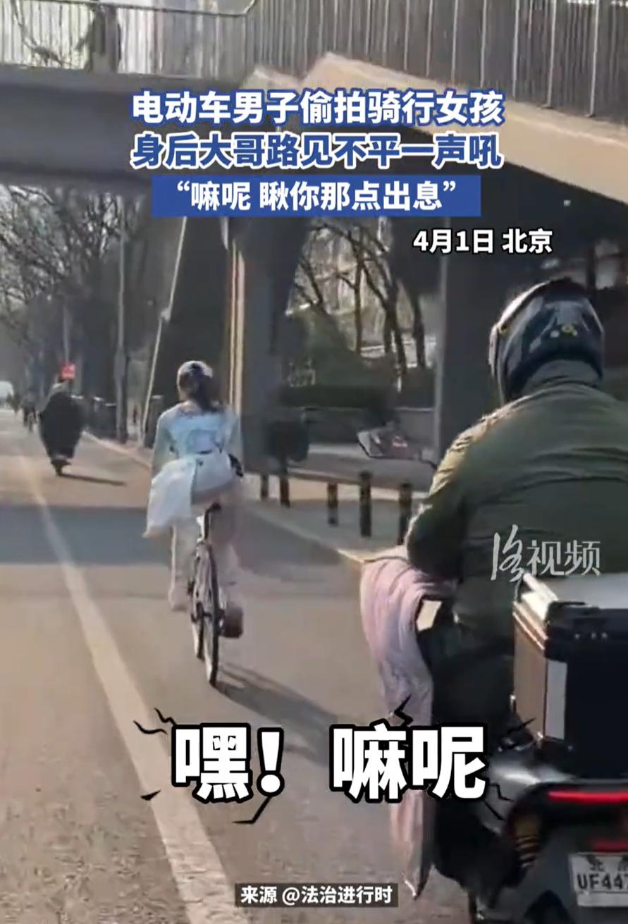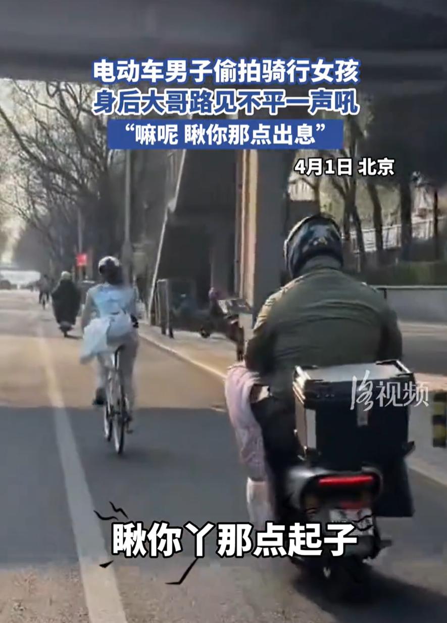 “瞅你丫那点起子!”北京,一男子骑车出门,发现另一面男子骑着电动车一路尾随一名骑行女孩,行为十分怪异,男子就跟上去确认,这才发现,对方竟然在身后偷拍,随后男子当街训斥他没出息 当时,这位大哥骑着车出门,路上碰见一男的骑电动车,老跟着前面一个骑单车的姑娘。开始大哥也没多想,以为就是顺路。结果到了一个红绿灯路口,大哥凑近一看,嚯,那男的举着手机,镜头正对着姑娘的背影,一路在那拍 大哥当时就来劲了,直接吼了一嗓子:嘿嘛呢!瞅你丫那点起子! 这话在北京话里,属于听着不脏,但分量特别重的那种。起子就是本事、能耐的意思,说你这点出息,连个正面都不敢露,就知道在背后干这种不上台面的事。那男的一听,吓得手机一收,转头就跑 有网友说:穿出来可以,拍照不行? 这话听着就不对。问题压根不在穿什么上,而是人家没同意,你凭什么拍?大街上谁给你的权利,拿手机对着陌生人录来录去?这不是穿多穿少的事,是尊重不尊重的事 大哥这声吼,吼得不只是一句脏话,吼的是很多人想说但没说出口的那口气。很多时候,路上遇到这种事,大家要么没注意,要么不想惹事,能出声的人不多。大哥这一嗓子,其实是替大家把话说出来了,你这种行为,就是没出息,就是丢人 男子偷拍骑行女孩 大哥怒吼没出息