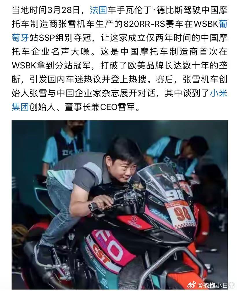 张雪机车夺冠是一个中国奇迹张雪的历程真的是一部奋斗史 刚刷到张雪机车两连冠的新闻,激动得手都在抖!打破欧美日垄断、首次登顶WSBK中量级组别,这不仅是张雪的胜利,更是所有中国智造从业者的骄傲,太振奋了!