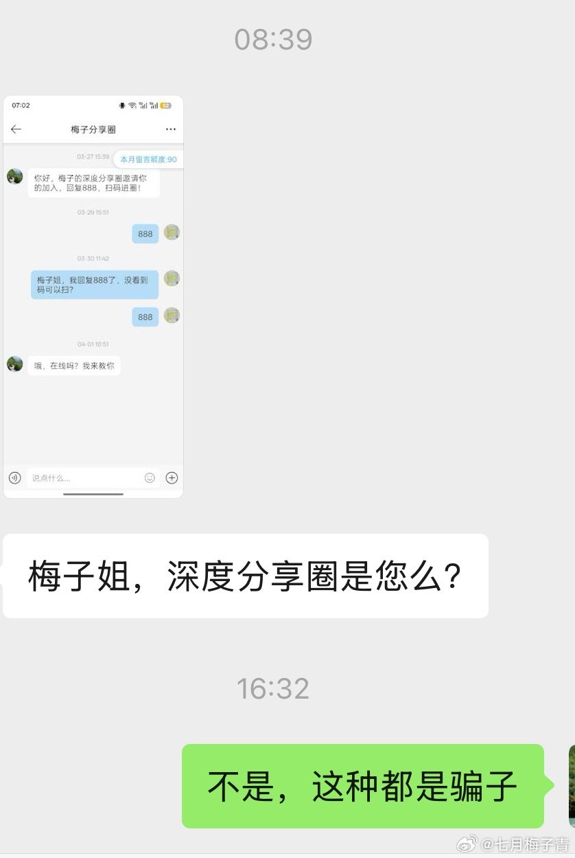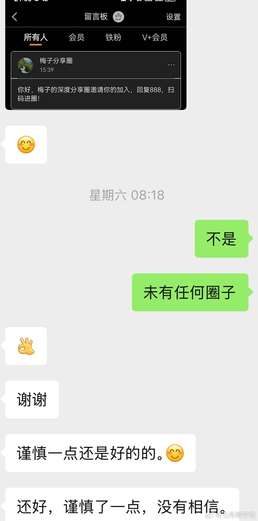 已经有不少人问我这个所谓的“梅子分享圈”是不是我?回答:不是,这些都是冒充我的账号。再说一次:我没有任何所谓的圈子、群组、也不建任何群、更不会主动和任何人说话!首先我没有那么闲、其次所有圈子分享股票的行为都是违法违规的!七月梅子青