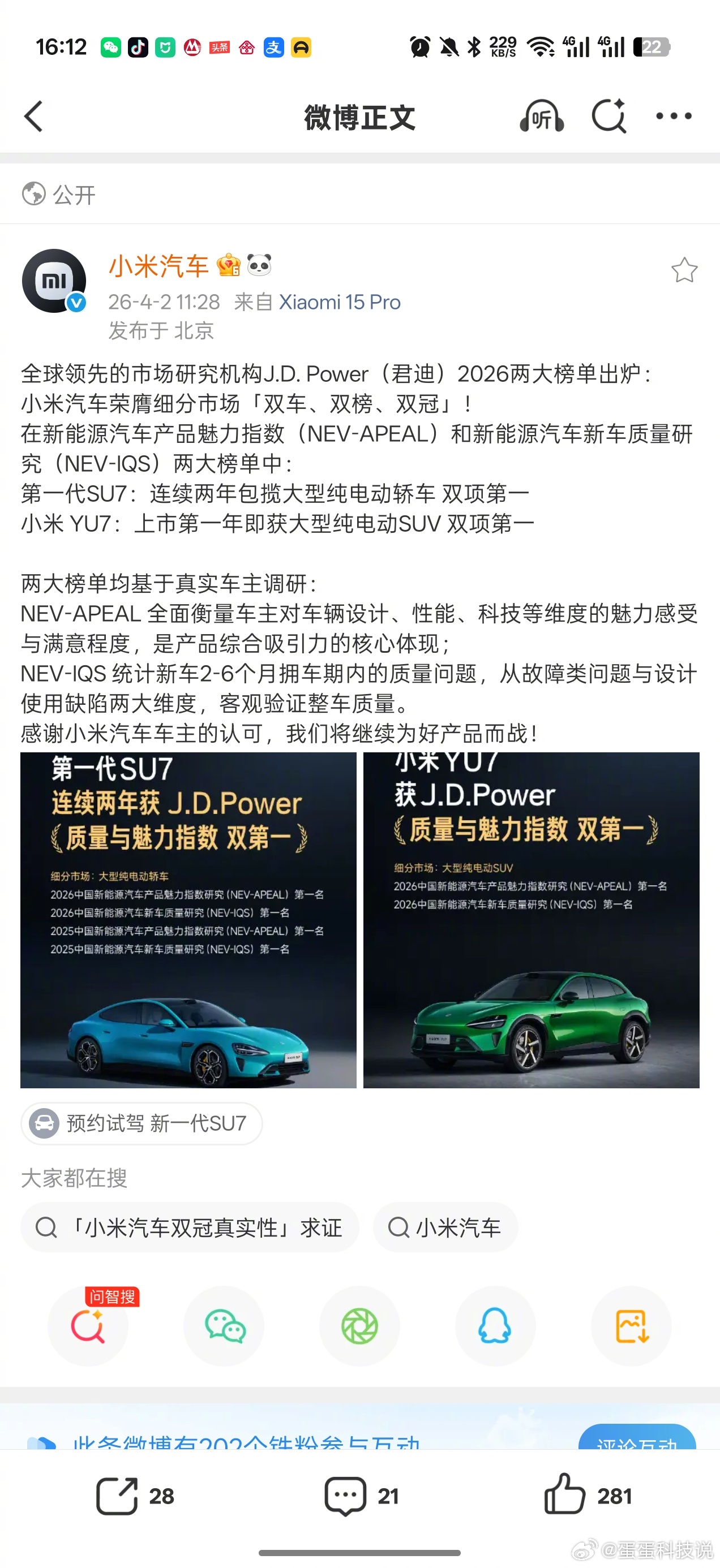 不只是JDpower,IQS里小米汽车也做到了第一,如果这都还不相信它的质量好,那么第三方车质网,在去年发布的车质网报告中,小米YU7也是第一。多个权威机构共同认证,真就印了那句“越是证明,越是发现其实力的恐怖”。马上晚上新一代小米SU7拆车,质量到底咋样?咱们亲眼看!