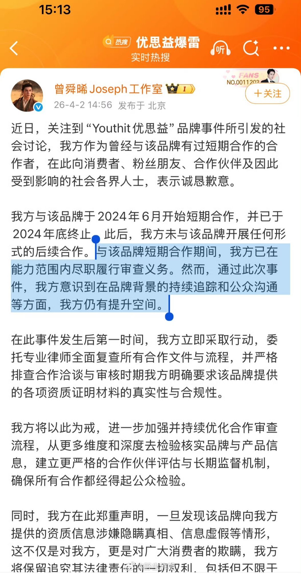 曾舜晞工作室回应优思益爆雷红利我来享,风险粉丝扛,代言前不做尽调,出事后光速切割