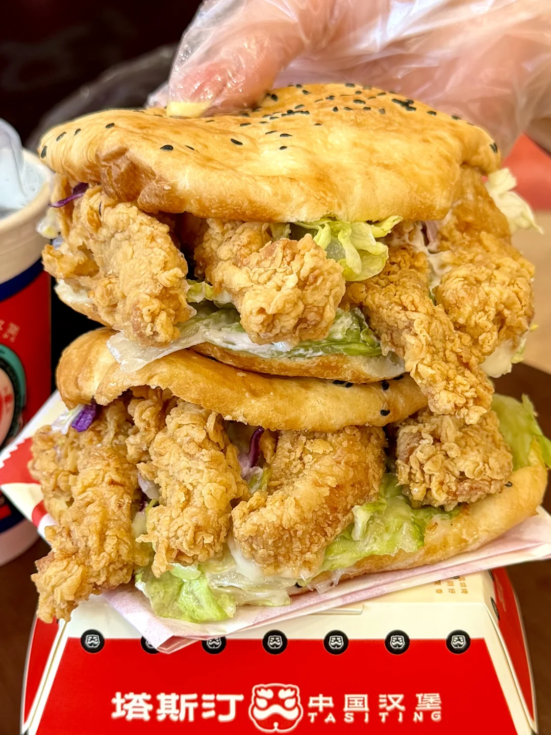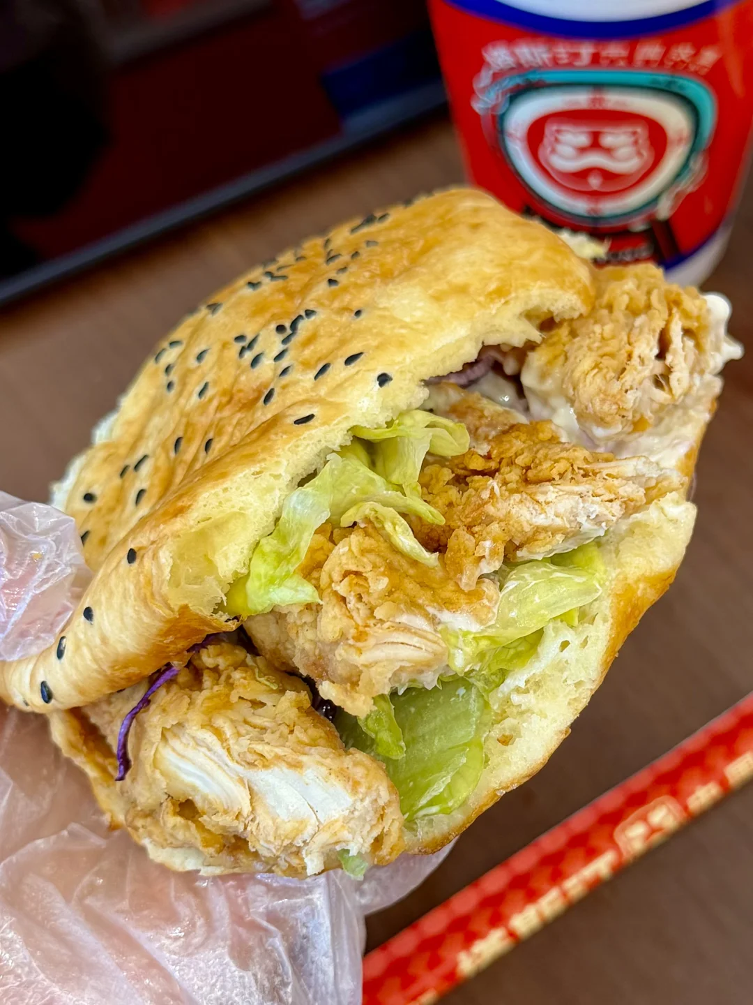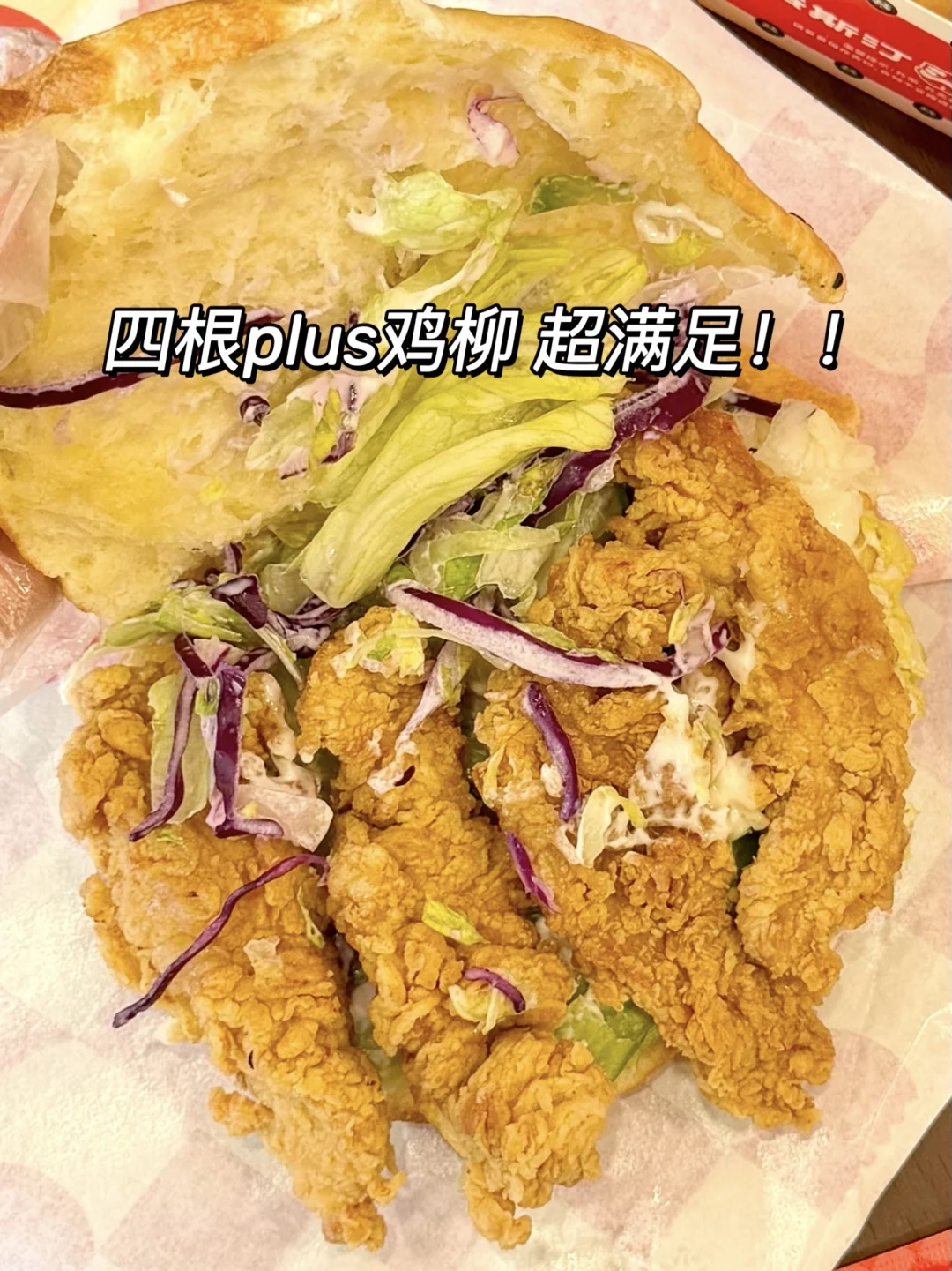 里面塞了4根黄金鸡柳,现炸的外皮酥到掉渣,肉感鲜嫩又扎实!!搭配手擀现烤的堡胚热乎乎软韧有嚼劲,还有双色沙拉酱+生菜,一口下去酥香+鲜甜+脆爽三重暴击!每一口都好满足啊!!