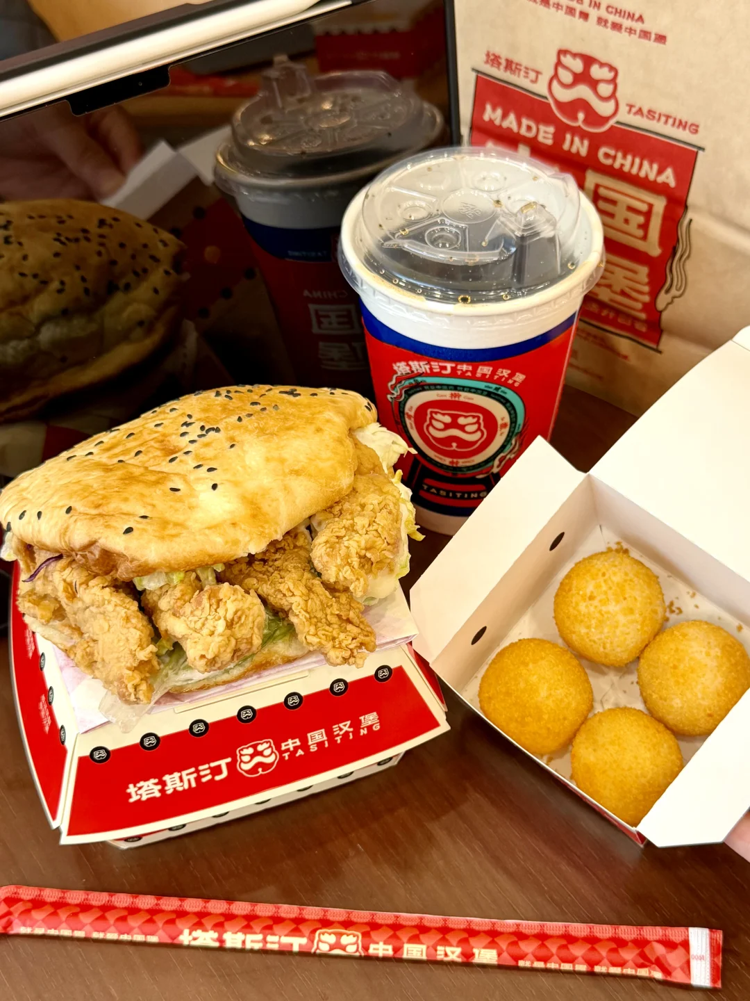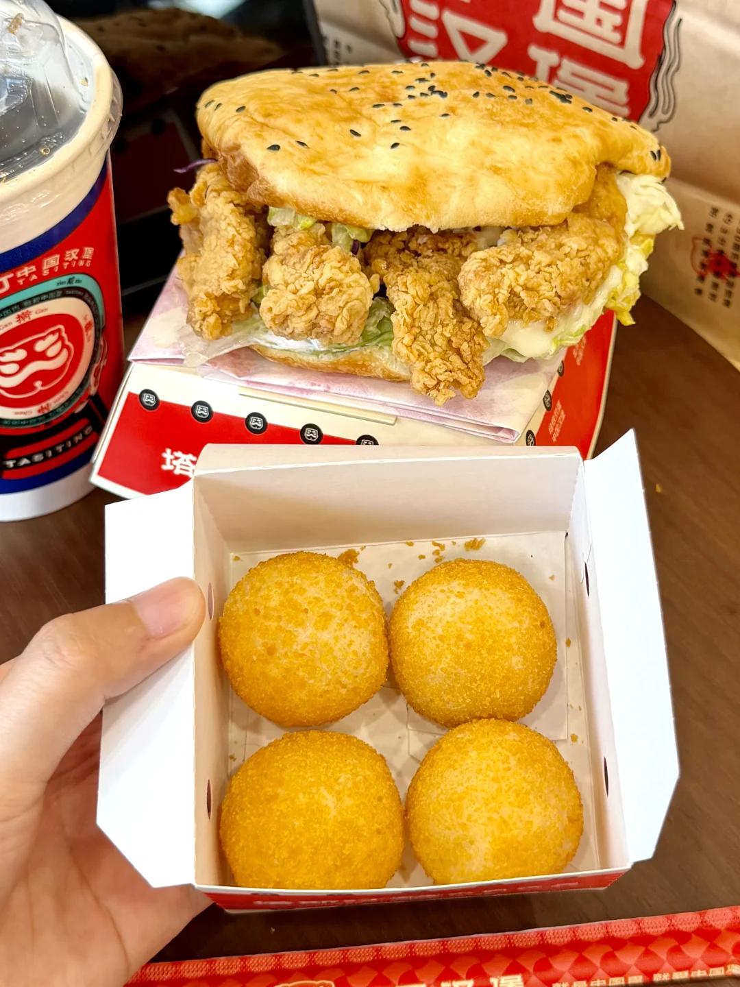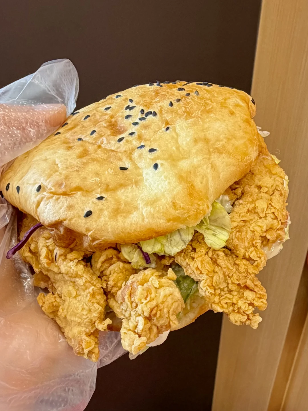 里面塞了4根黄金鸡柳,现炸的外皮酥到掉渣,肉感鲜嫩又扎实!!搭配手擀现烤的堡胚热乎乎软韧有嚼劲,还有双色沙拉酱+生菜,一口下去酥香+鲜甜+脆爽三重暴击!每一口都好满足啊!!