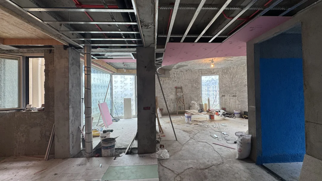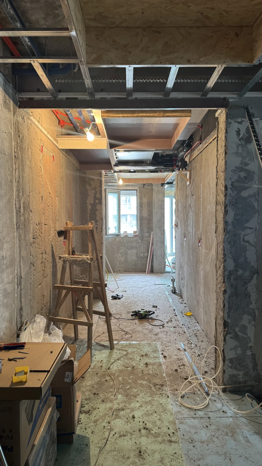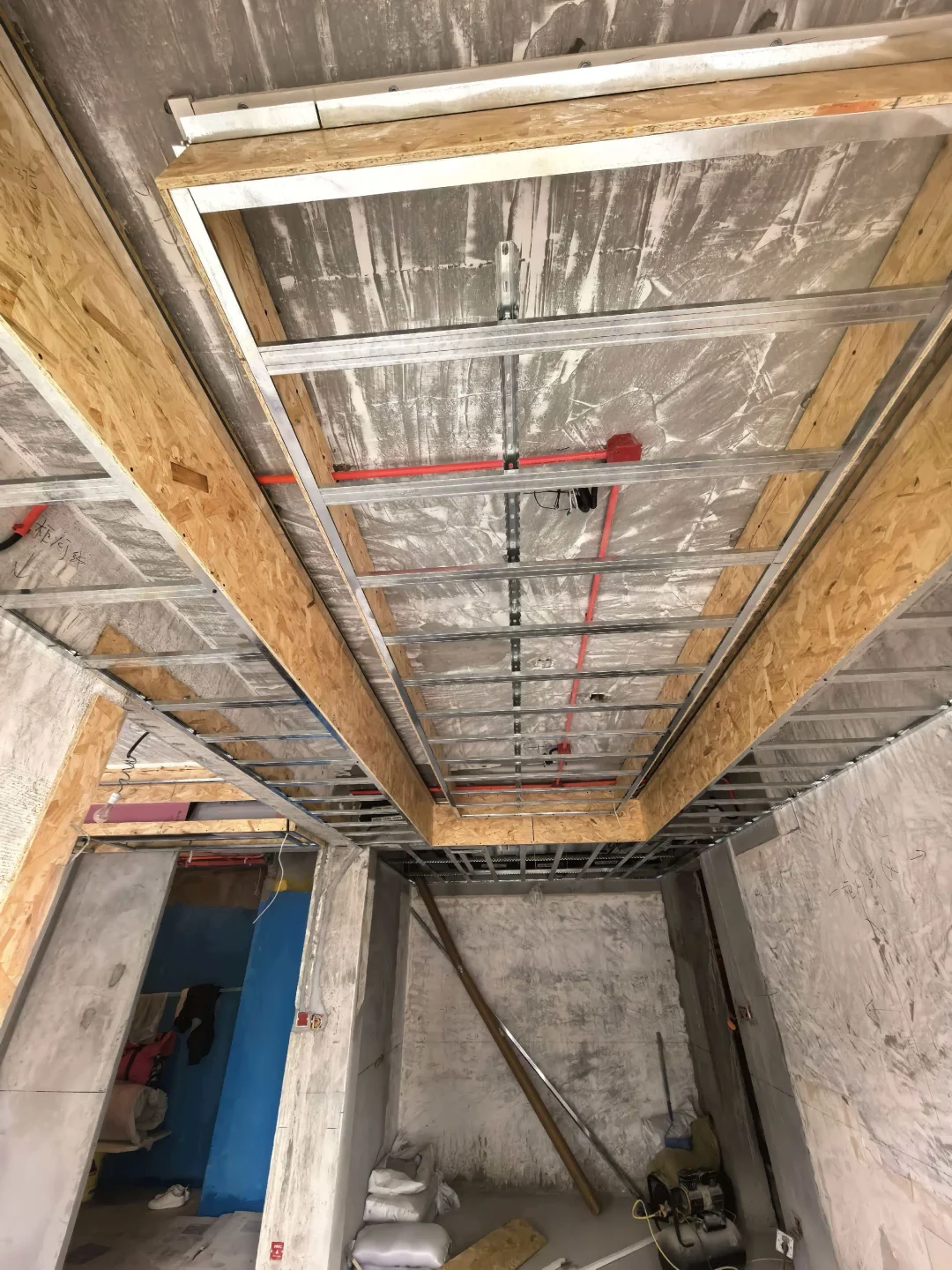 瓦木工同时施工中,木工吊顶框架基本完成,下周石膏板安装,瓦工贴地砖中预计本周结束。把握好节奏现场有条不絮地进行着~
