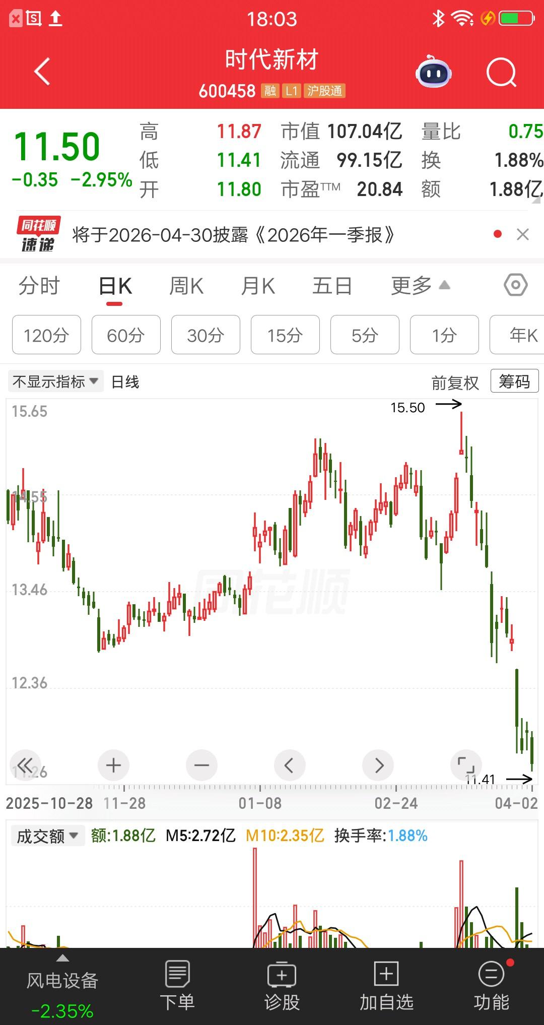 财运来了挡都挡不住呀,公司发布利好消息,4.54万股东大概率要吃肉了。时代新材,与风电各大主机厂签订23.02亿元合同。 看股票日线图,这波杀跌很惨呀,15个交易日跌幅超过20%。而且今天再次破新低,目前看是没有止跌。就看主力给不给力,趁着利好拉一波,让散户回回血。 当然有利好不一定会涨,但是没利好一定不涨,A股的现状就是如此,话糙理不糙。
